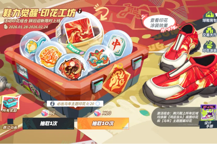 在任意一双球鞋所有区域,同时涂装【鸿运当头】底图和【马年】主题图案印花,即可解锁专属【辞旧迎新】特殊印花组合!