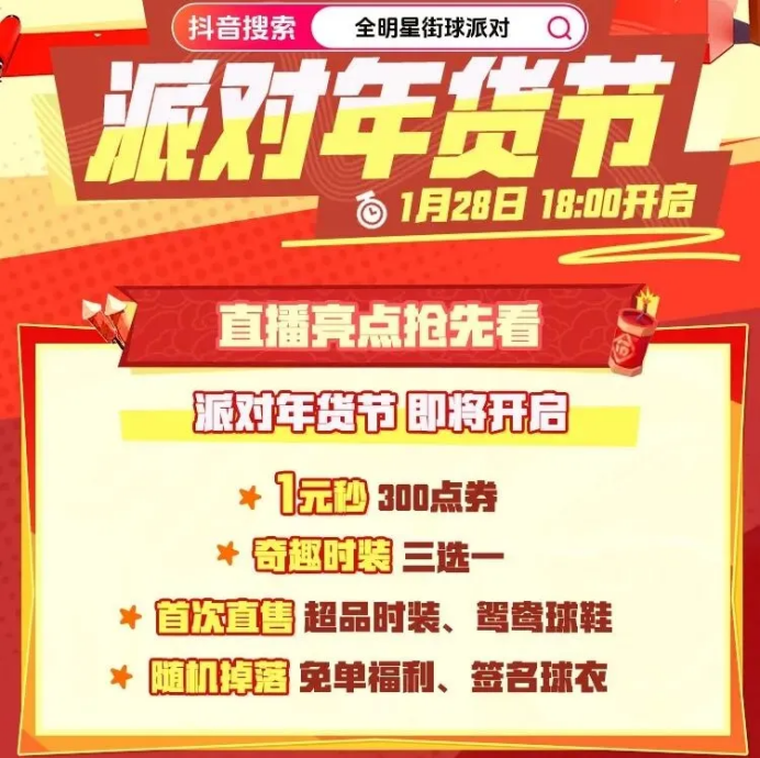 今晚18:00,让我们相约在抖音的 @全明星街球派对官方直播间,这次的“派对年货节”直播你绝对不容错过!