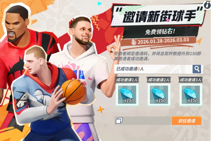 街球手分享自己的专属邀请码,邀请新玩家进行绑定操作。成功绑定后,受邀者即可领取受邀者奖励:巨星登场券*2。若受邀者总杯数达到150,邀请者即可“成功邀请”并能领取相应的邀请奖励,累计可获得450钻石。