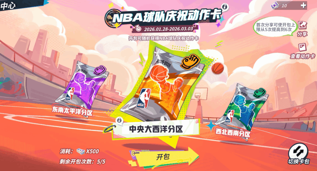 这一次,我们想把那份属于你的主队情结带进派对!活动页面共包含3种球队庆祝动作卡卡包,每种卡包分别包含10支NBA球队的庆祝动作卡。每开一次对应卡包,会随机获得该卡包内其中1支球队的庆祝动作卡。