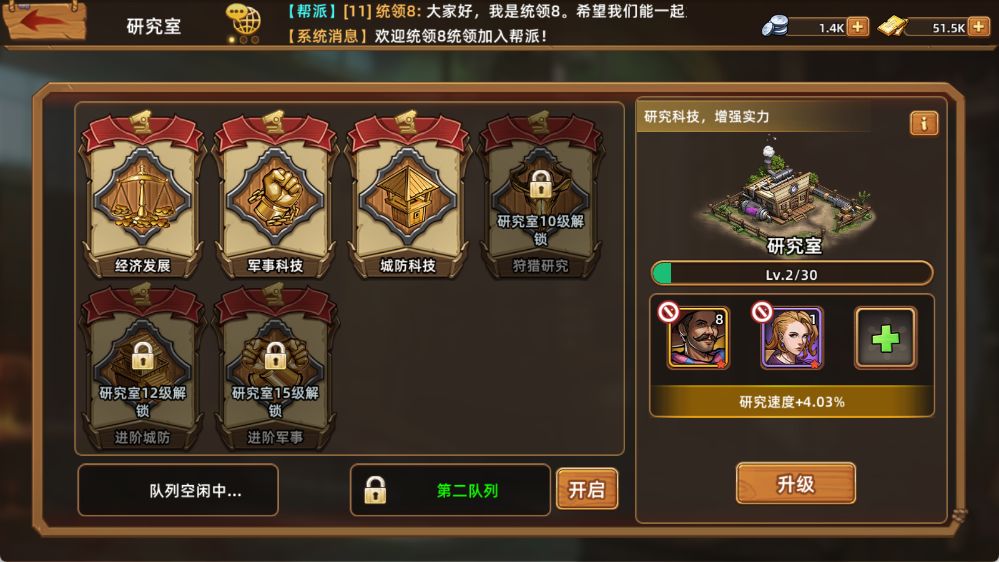 · 行政厅(第一优先级):发育的“发动机”!每升一级都会解锁新建筑(军营、研究室等)和关键功能(帮派系统、野外采集等),必须优先升级。升级时优先用任务赠送的加速道具,金币尽量留到后期应急,别浪费在前期加速上。