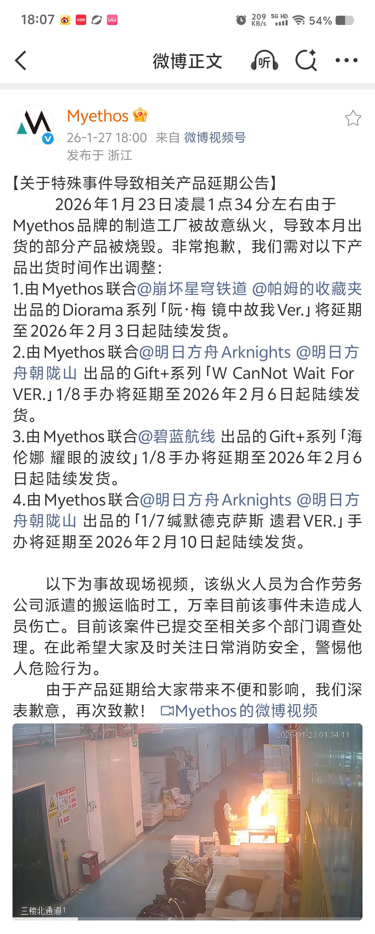 祸,据悉Myethos的合作工厂在1月23日凌晨被人故意放火,导致一批准备出货的手办直接烧没了。官方发了公告,确认是临时工干的,幸好没人受伤。