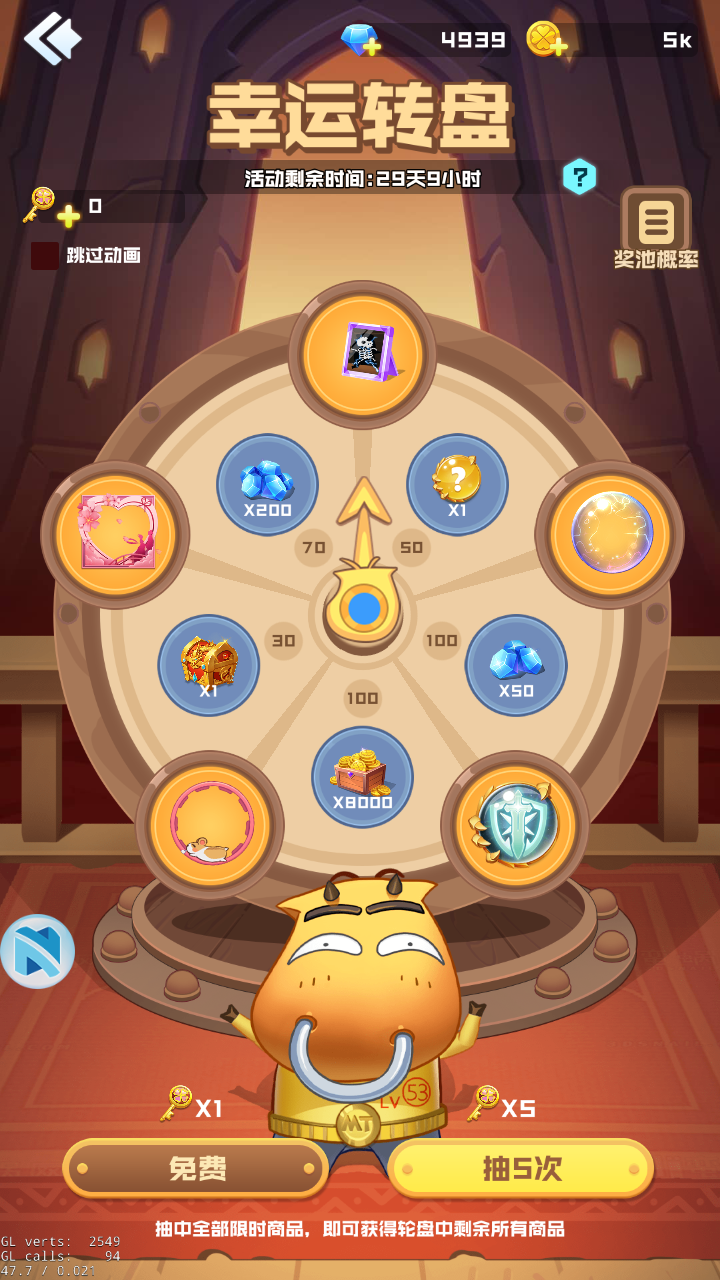 活动期间,合计共有4档幸运转盘礼包可供购买,成功购买后可通过获得的“幸运钥匙”进行抽奖,每次抽奖会消耗1个“幸运钥匙”,已抽中的奖励后续不再进入奖池,奖励抽完后概率会叠加到其他商品上;当抽中到所有的限时商品,即可获得奖池中所有剩余奖励;