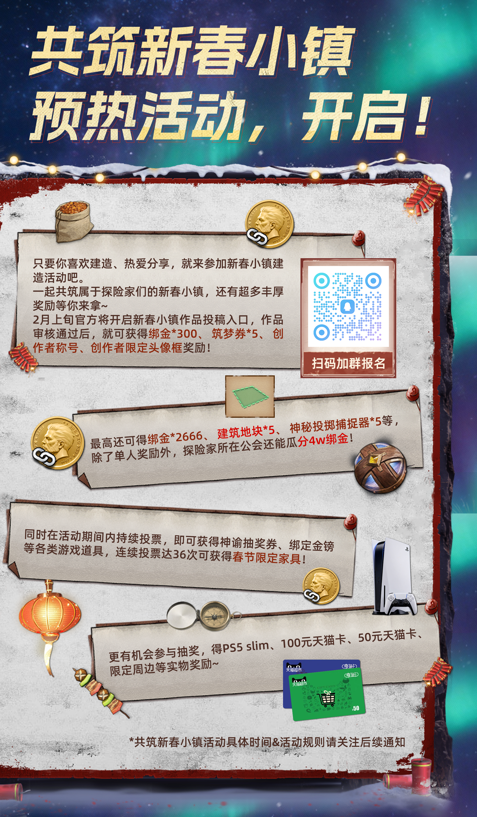 想要参与“共筑新春小镇”活动的探险家们,快快扫码进群报名参与活动,资格认证通过后,可领取