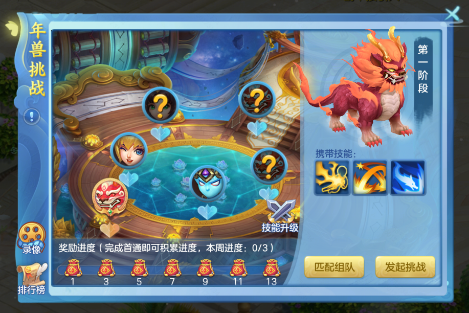 1月29日维护后至2月25日24:00,开启年兽挑战活动,角色≥50级的少侠可5人组队通过“新春使者”向年兽发起挑战。