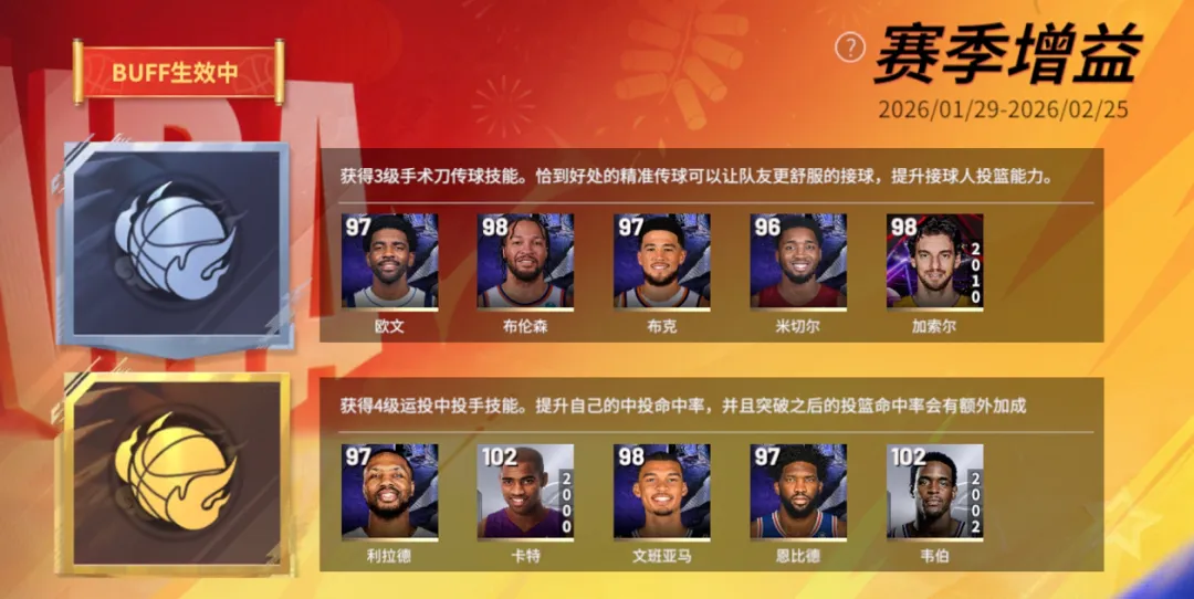 新增赛季限时增益系统,即在3v3/王朝排位中,使用指定球星将自动获得额外技能,仅本次赛季时间内有效。使用指定球星,绝杀比赛更轻松哦!