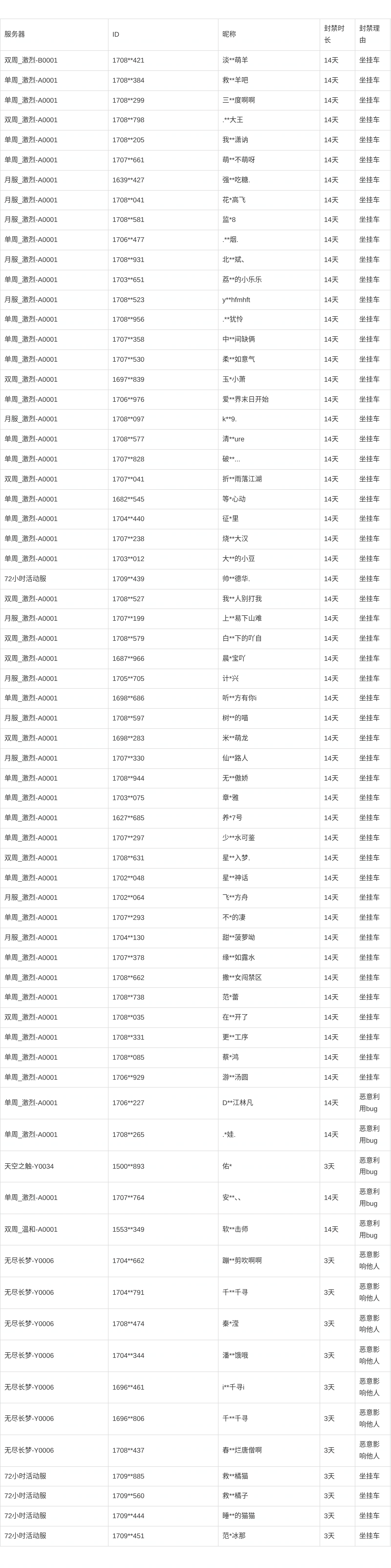 以下为近期因违规处罚情节较重的玩家公示名单,相关角色已进行复核,违规属实。如有任何疑问,请通过游戏内客服进行反馈。
