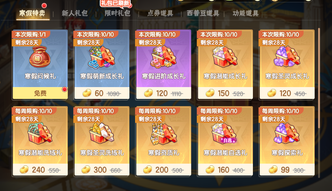 寒假特卖礼包上线,小西普们可前往[商城]—[培养]—[寒假特卖]购买需要的特卖礼包