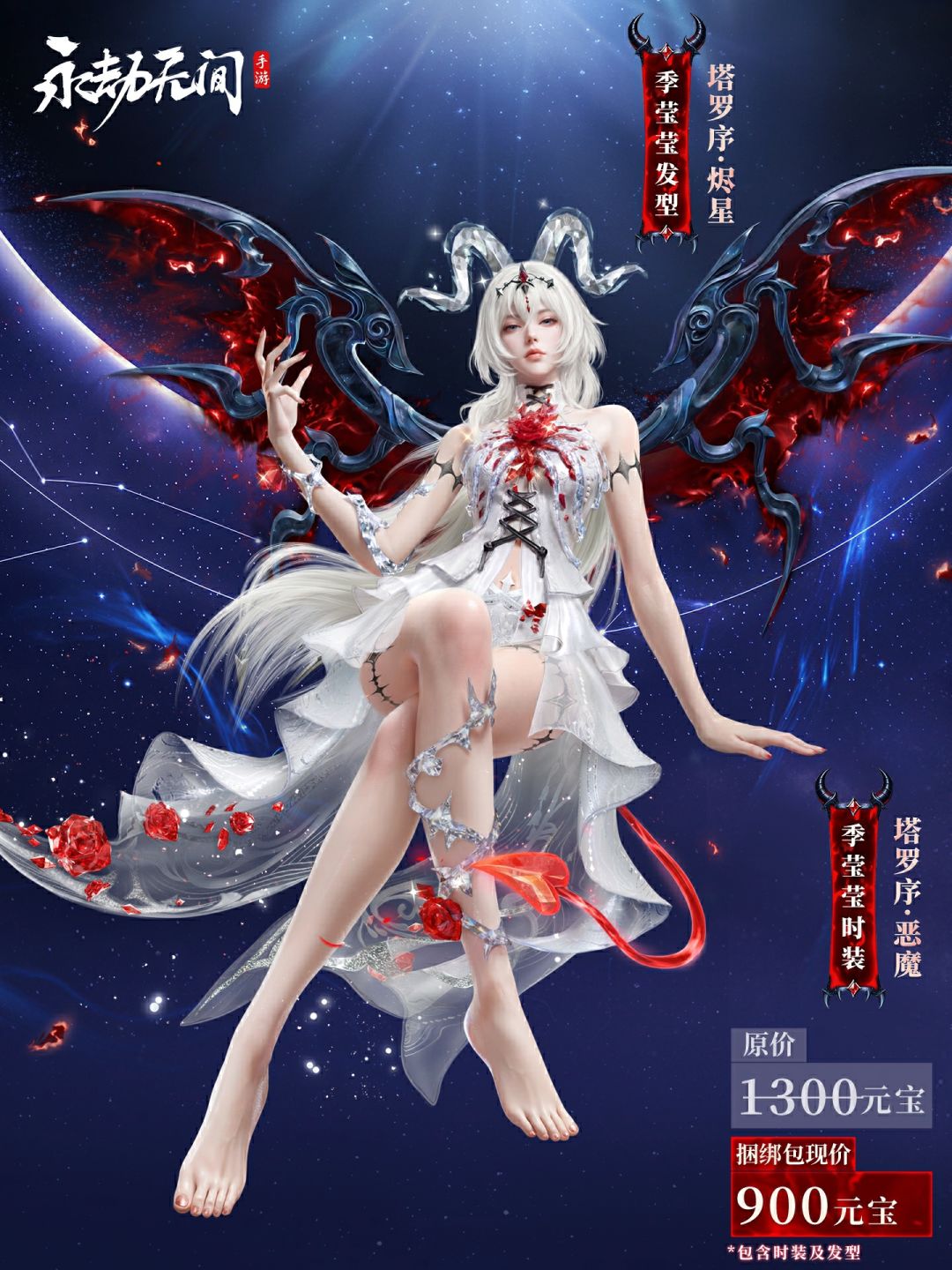 1、 新增季莹莹捆绑包【塔罗心火捆绑包】。捆绑包内含季莹莹极品时装【塔罗序·恶魔】、季莹莹极品发型【塔罗序·烬星】、捆绑包原价1300元宝,折扣价900元宝。单独购买对应单品即可享受折扣,购买捆绑包将享受更多折扣。
