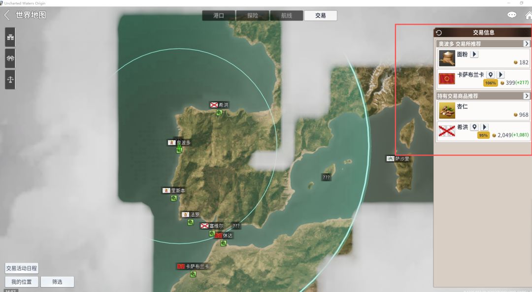 我们在初期做主线公会任务时候,可以把欧洲的各个港口地图开一下,这样也方便我们后期贸易(看哪些港口有特殊商业活动如流行,暴涨等)