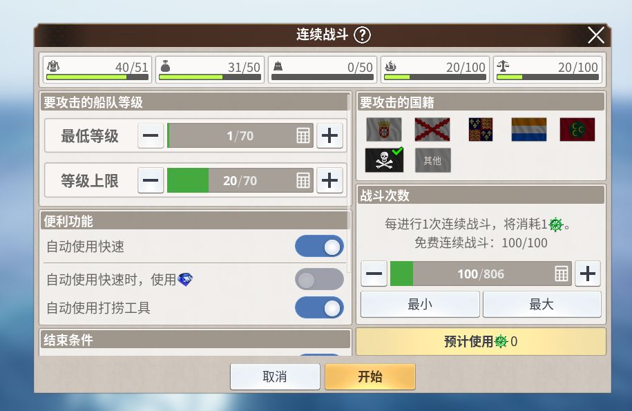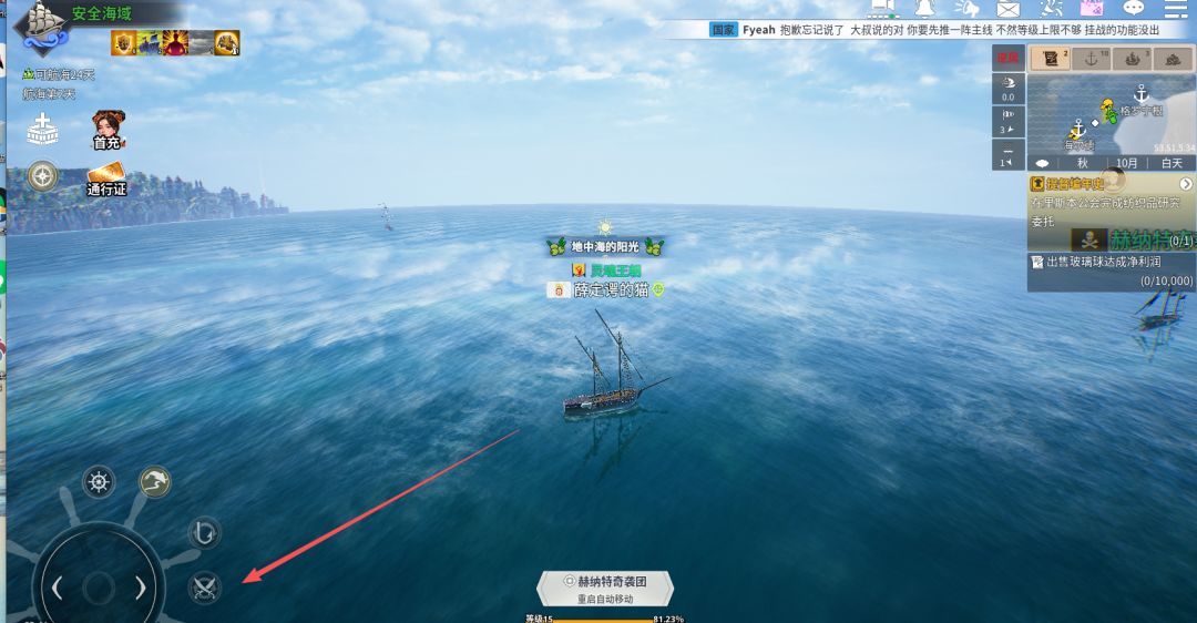 8. 船长有事无法跑商做主线及任务时候,我们可以挂机海事战斗!需要舰队等级15左下角罗盘处有双刀标志,既可开启自动刷战模式!可以获取一些材料装备等!