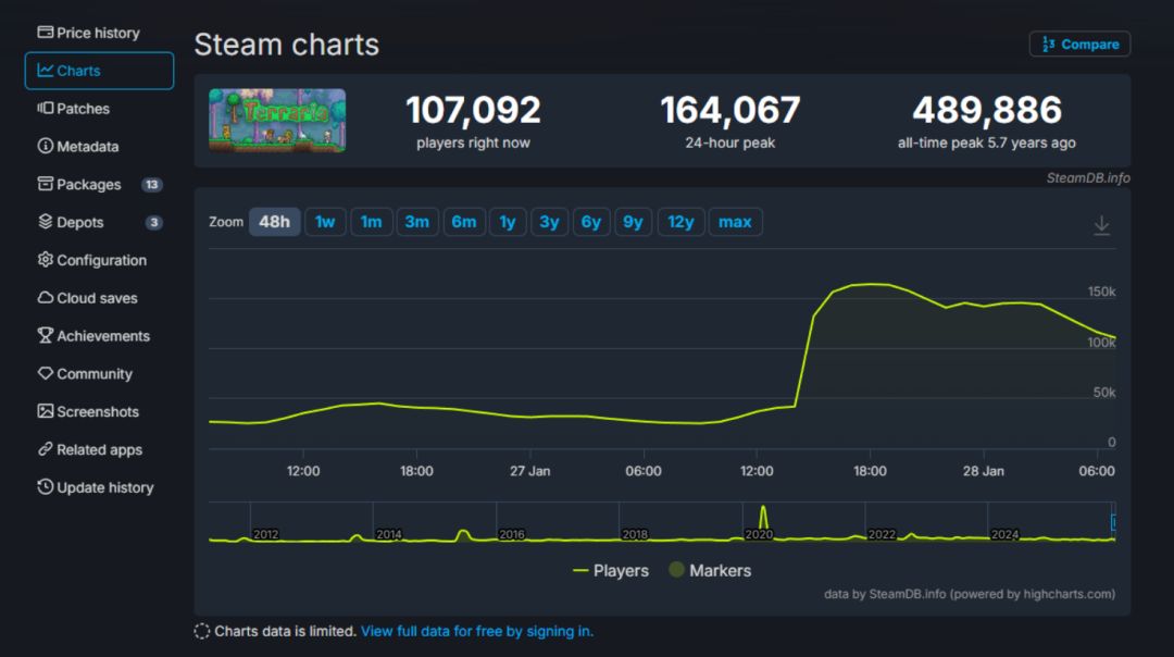 Re-Logic再度用行动推翻“最终版本”的说法,屡次承诺最后一次更新,却持续为游戏注入新活力。《泰拉瑞亚》1.4.5版本正式上线后,游戏热度直线飙升,Steam平台数据迎来大幅上涨。