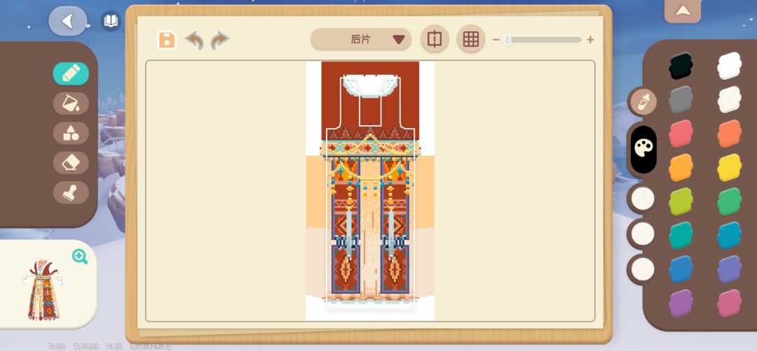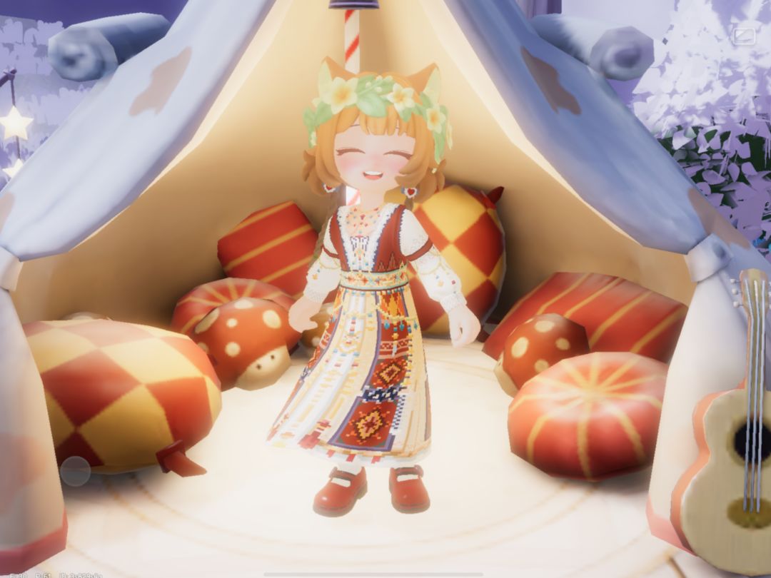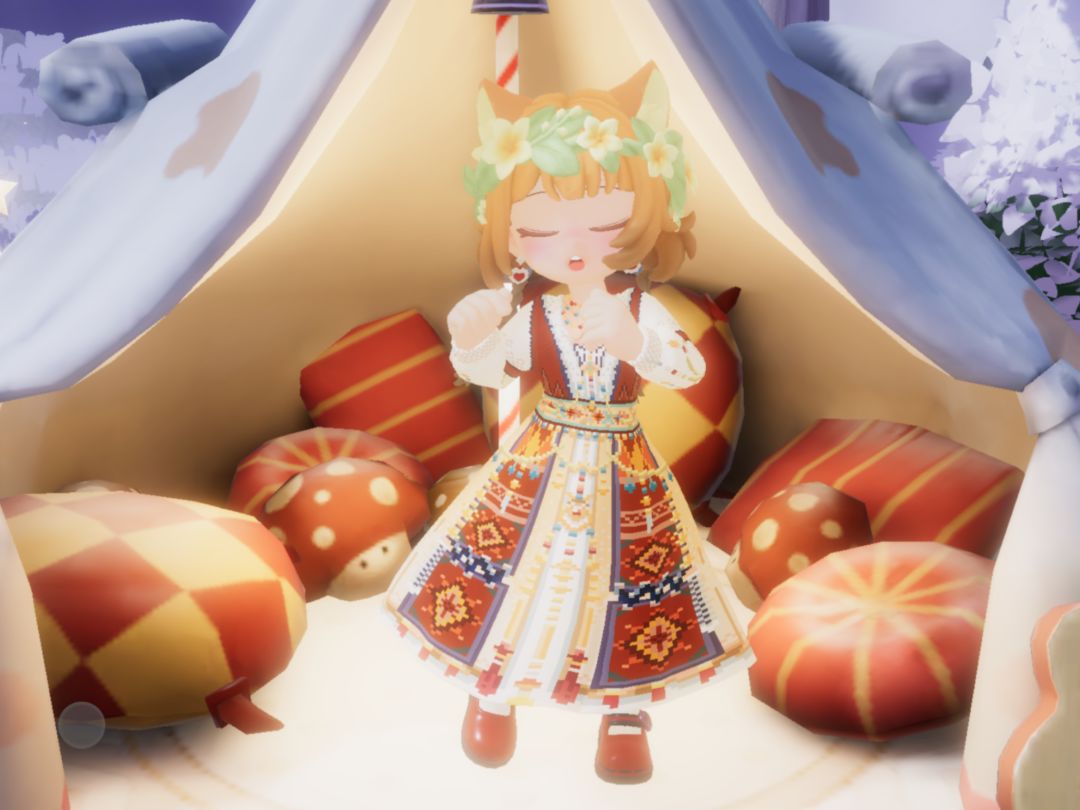 艾特来丝绸,五彩斑斓,似天上彩虹,落人间。衣服融合了传统艾德莱斯绸与精致纹样的维吾尔族服饰,“流霞”形容衣料如天边云霞般绚烂,充满异域风情。“云裳”则赋予其飘逸仙气,凸显服饰的文化底蕴与美感。