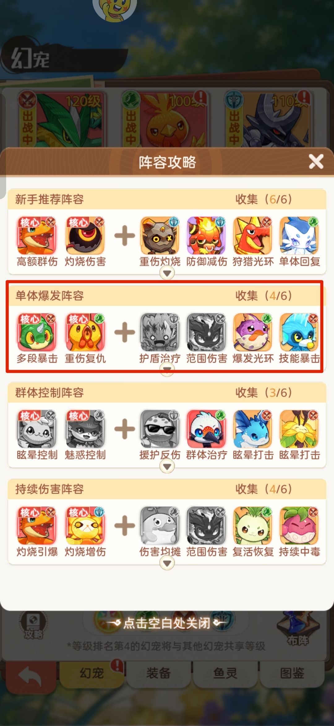 大家刚进游戏肯定关心组一个什么样的队伍可以舒适的推图。这方面游戏还是很贴心的,点开幻宠界面左下角功略按钮,就可以看到推荐的阵容。