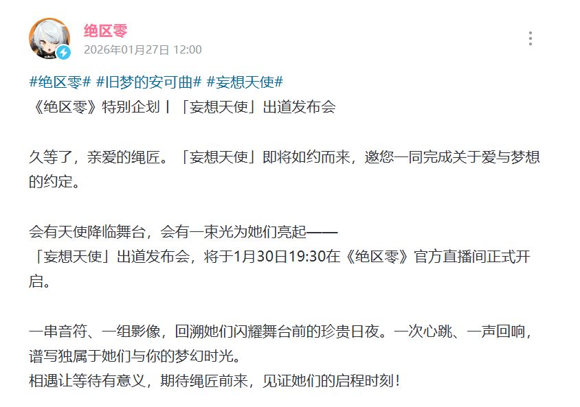 《绝区零》昨天官宣,2.6 版本「旧梦的安可曲」前瞻直播,将于1月30日19:30以虚拟偶像组合「妄想天使」出道发布会的形式,在官方直播间开启。
