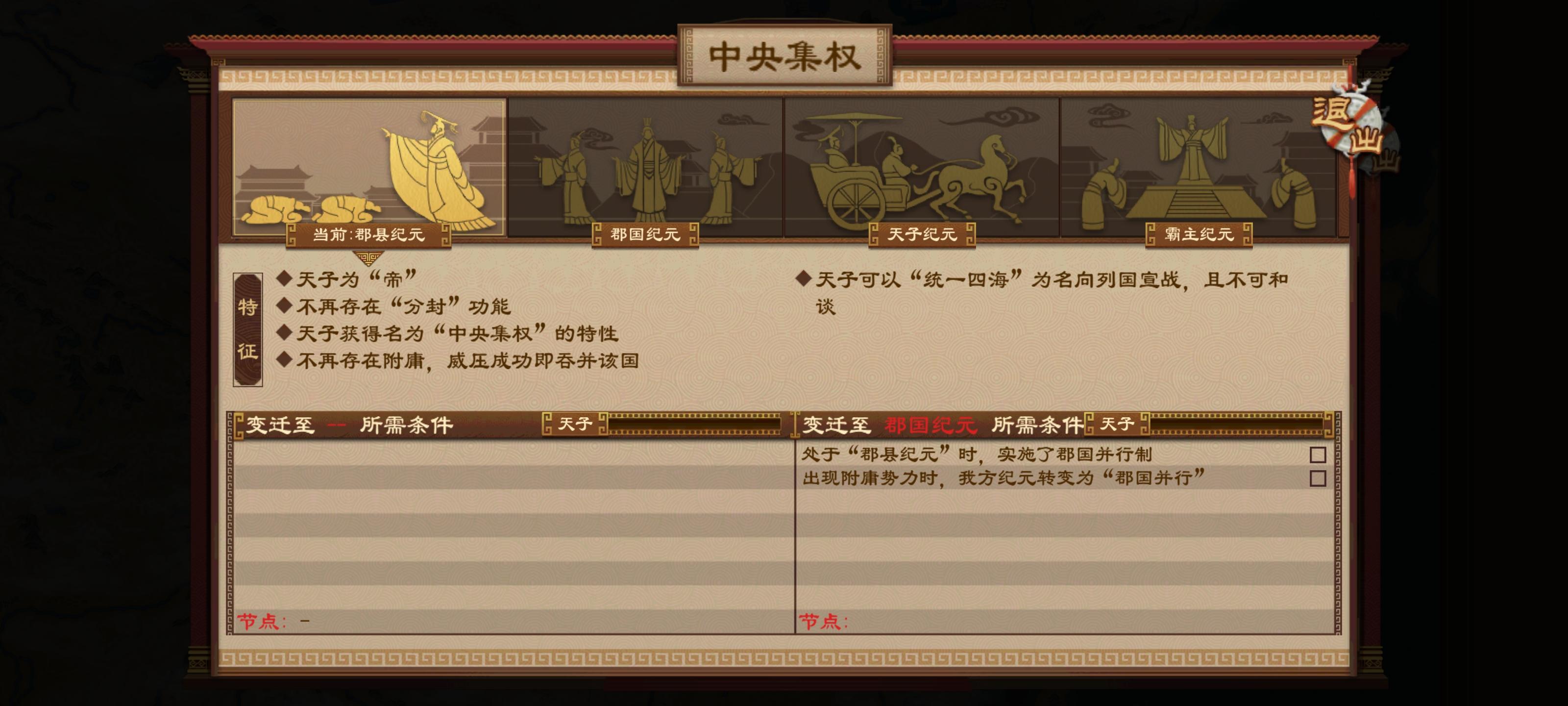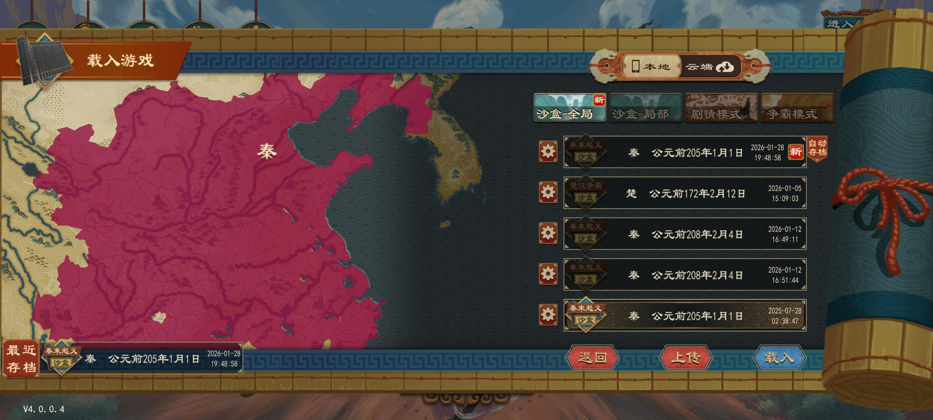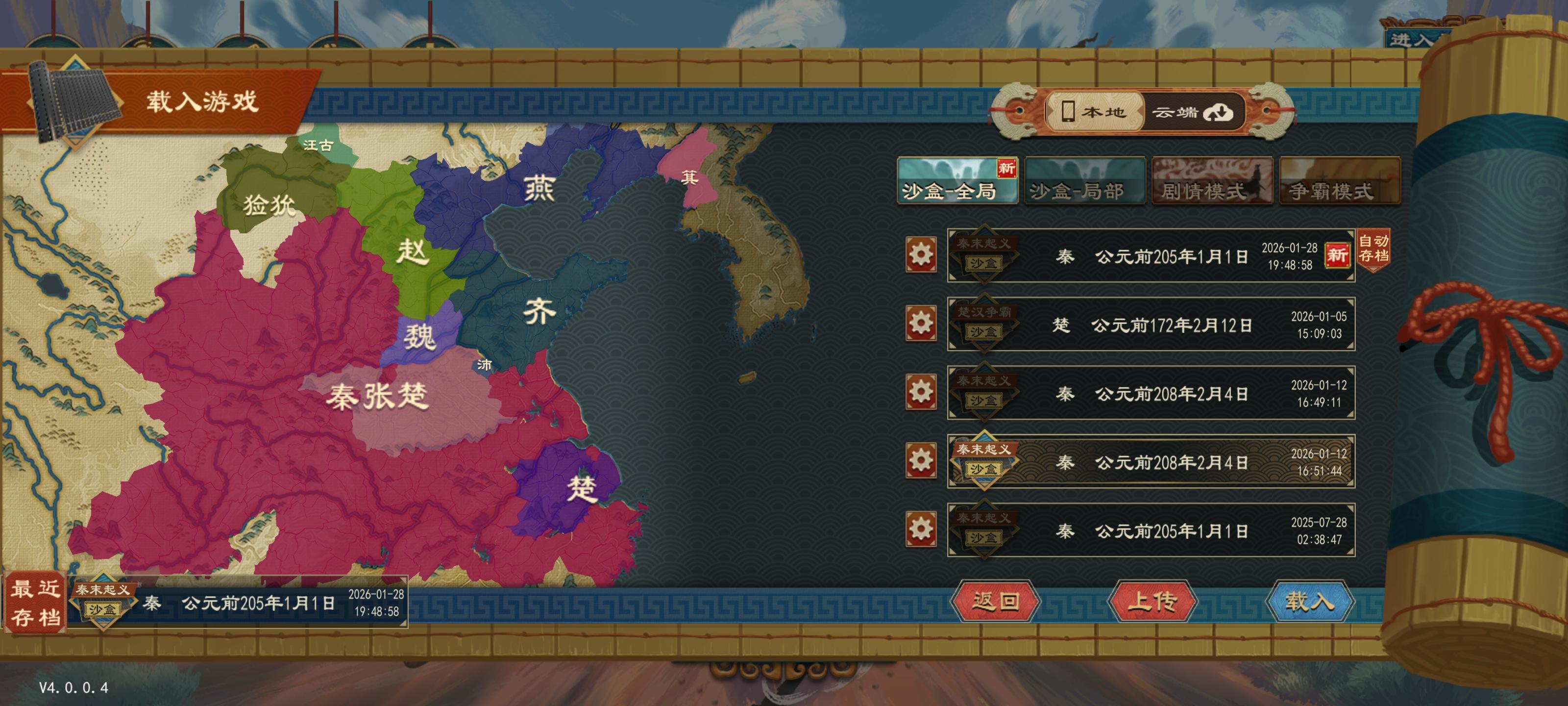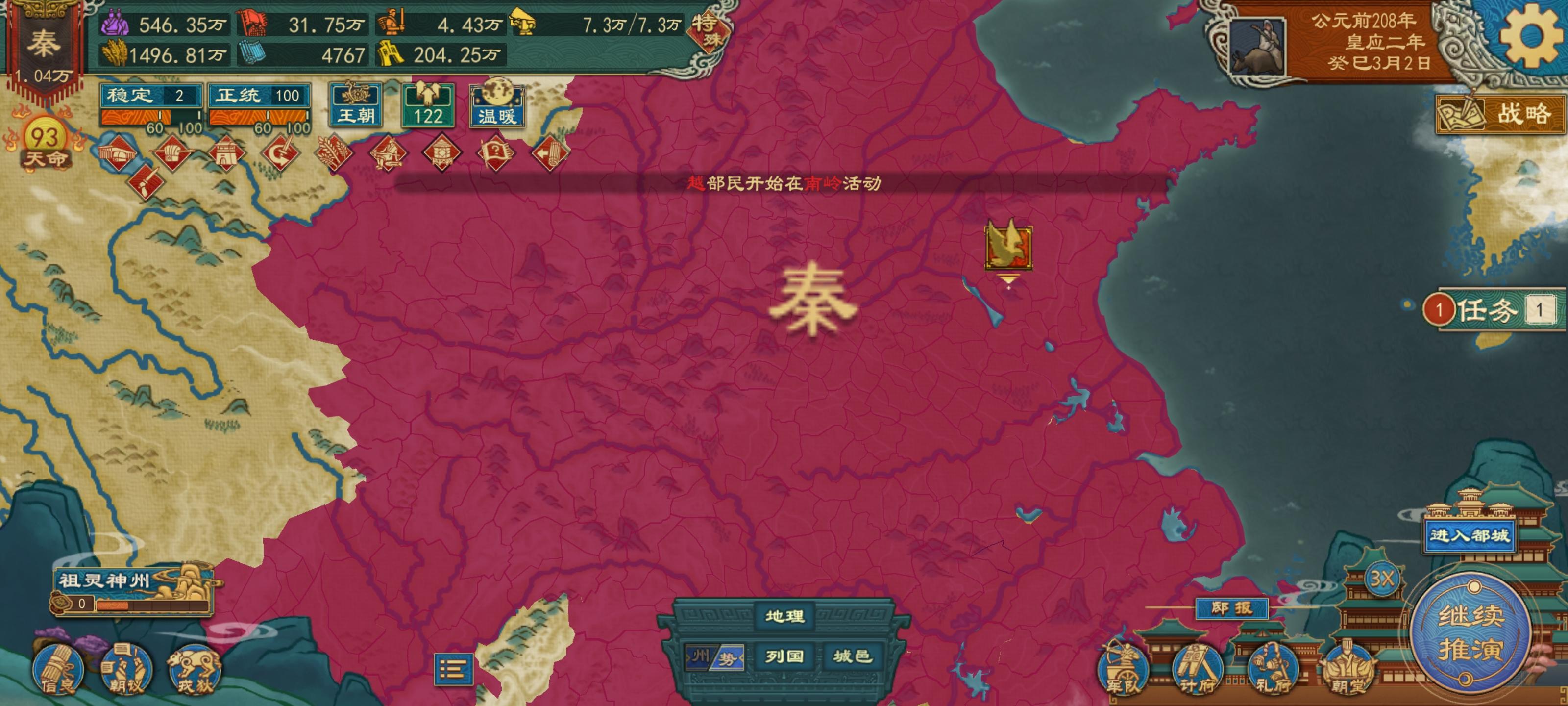 在秦末起义剧本中使用秦国开局直接投降(开局设置里把战争投降惩罚改成常规。族域系统关掉,配合下一条),再派大臣去威压就行了(注意一下威压任务时间,尽量让几个威压任务完成时间差不多,方便存档刷)。
