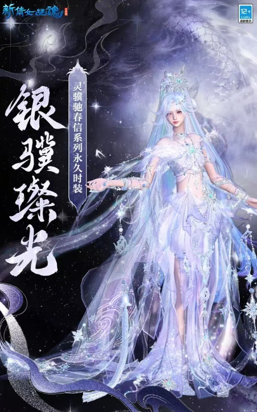 不过倩女端游的新年王炸可不止这么一波,继让玩家躺平的海量福利之后,全新马年灵骥驰春信系列外观——银骥璨光也已同步揭晓。女款时装一亮相就让不少玩家直呼仙女下凡,以蹄踏夜空,将繁星点缀于身的天马为灵感所设计的时装着实惊艳,上半身的星芒配饰搭配如幸运一般的薄纱外衬使得时装整体呈现出仙气飘然的质感。