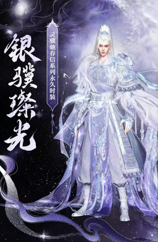男款的银骥璨光则重在凸显男性角色的硬朗与洒脱,时装版型采用经典的将军甲胄服饰,以雪青色内衬搭配浅紫色铠甲,在兼具梦幻感的同时也能呈现出角色绝佳的气质,尤其是质感拉满的高马尾白发,简直就是颜值的绝杀~