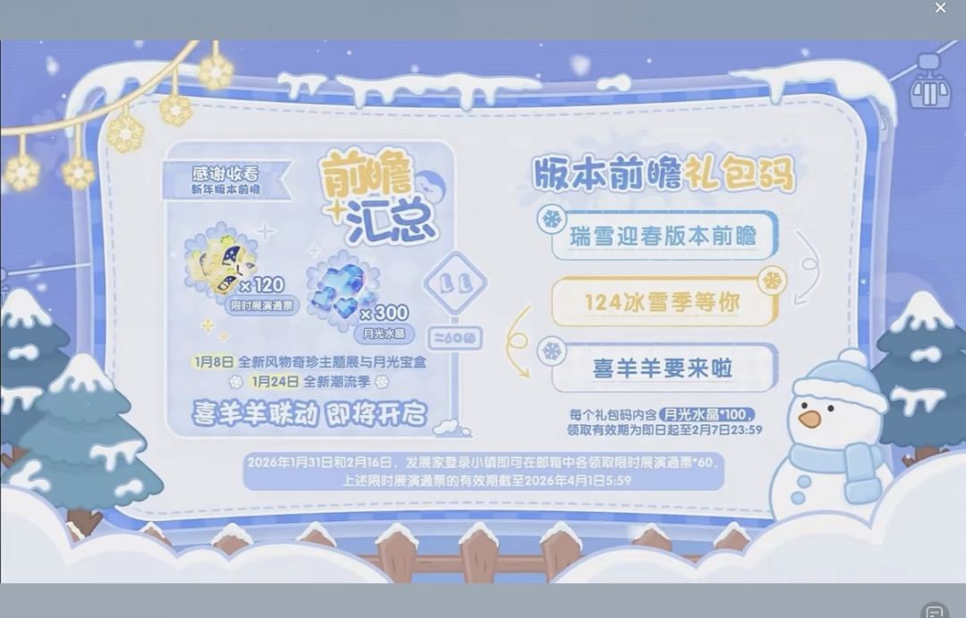 冰雪小镇于今日发布新年特别福利,包含限时展演通票及多组蓝钻兑换码,所有玩家均可通过游戏内指定途径领取。