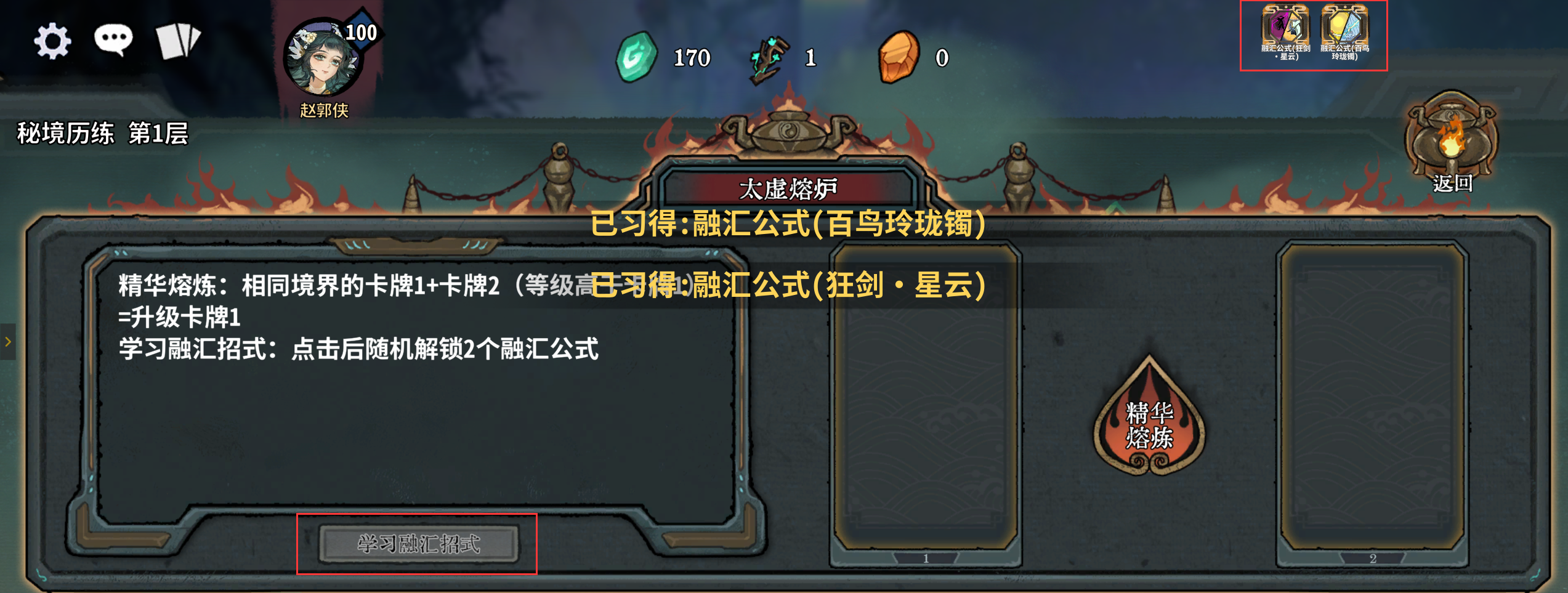 进入太虚熔炉后,点击学习融汇招式,可以获得随机的融汇公式(右上角查看),来进行合成,之前已获得的融汇牌也会自动学会融汇公式。但一般多数融汇牌没用,如果该地图节点是未解锁的,不建议消耗神机密钥解锁。
