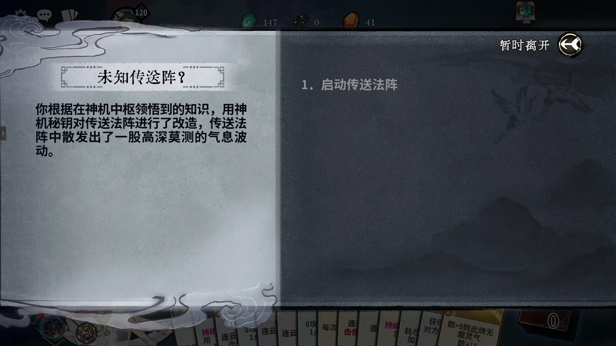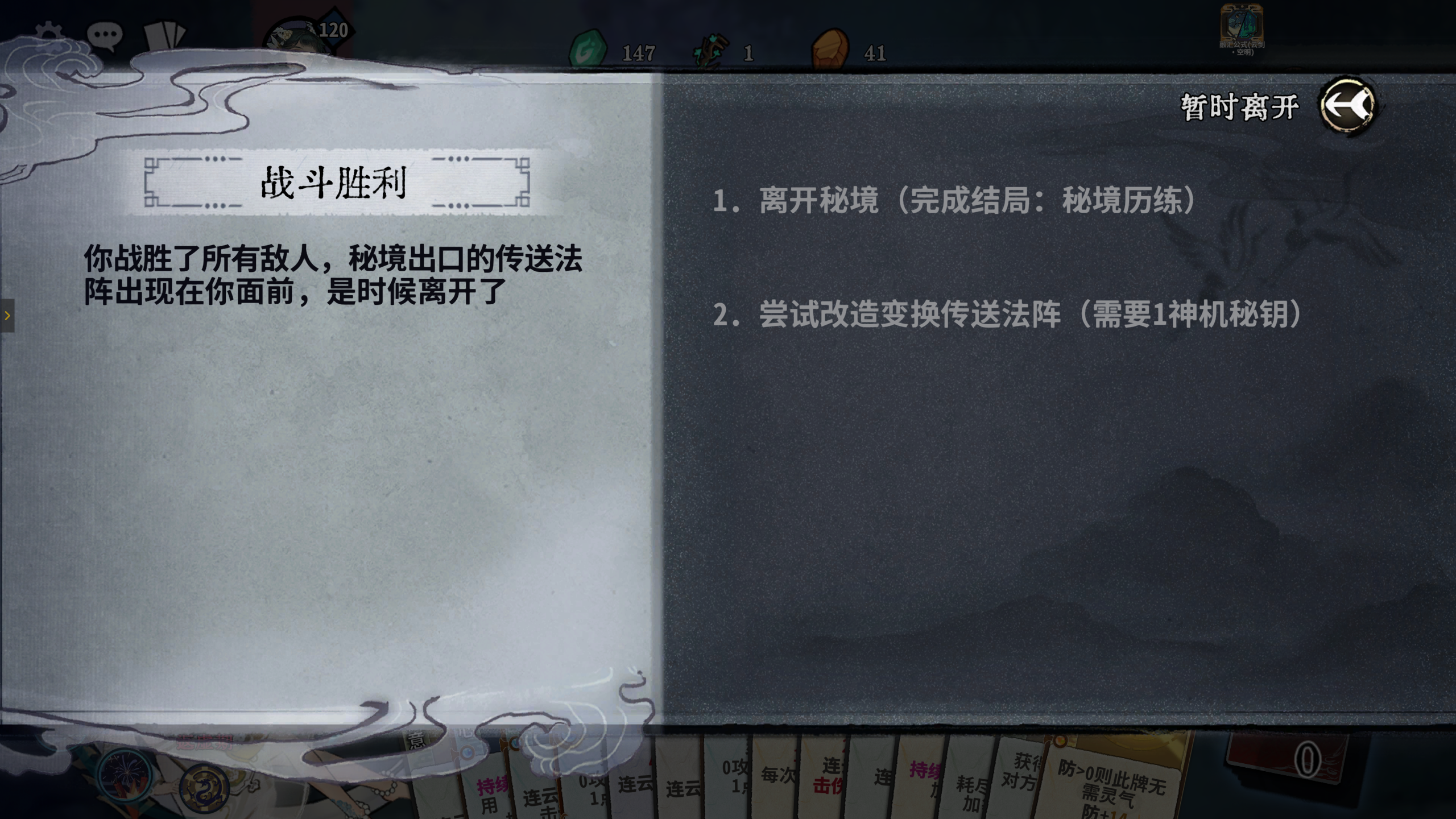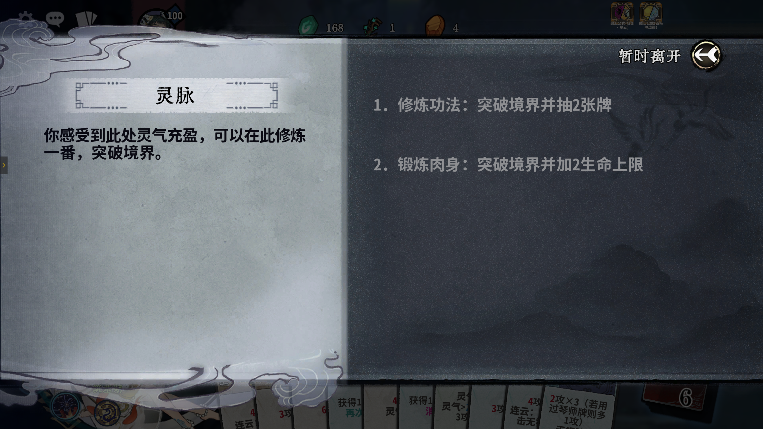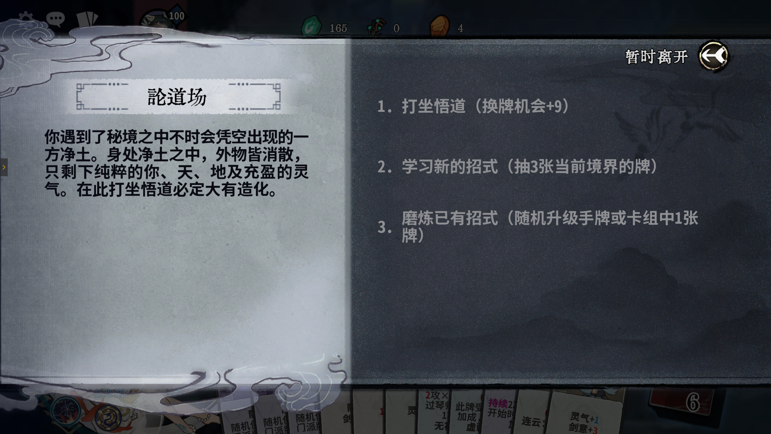 建议刷秘境第一层的随机事件为神来之砚,如果不是则退出本局,重开新游戏,直到秘境第一层的随机事件出现神来之砚,选择卡组手牌全变为神来之笔,尽量保证有8张神来之笔,有多余的再合成,因为前期神来之笔过渡很强,它从炼气期开始,就能变成任意境界的牌(包括化神期、返虚期等),能一直过渡用到突破化神期后再更换,这样前中期均不用换牌,换牌次数可全留到化神期再用。