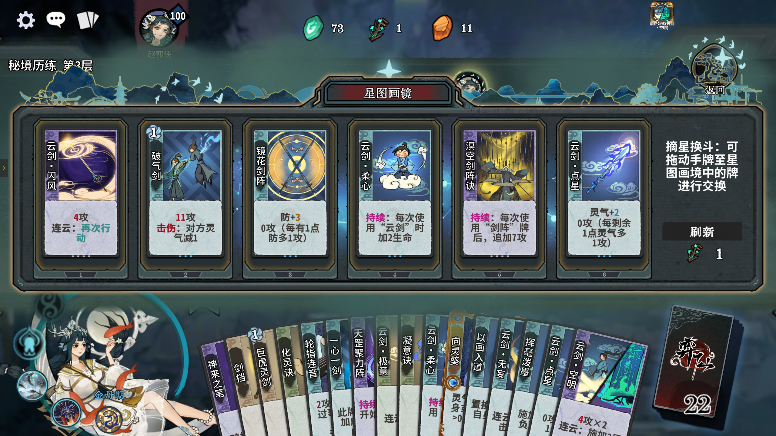 随机有6张牌,可以用等量手牌来换任意牌,当前画境牌可以不限次免费更换,但刷新画境牌需要消耗一个神机密钥。与商店等房间相同,在地图移动后,还可返回此处重新更换。
