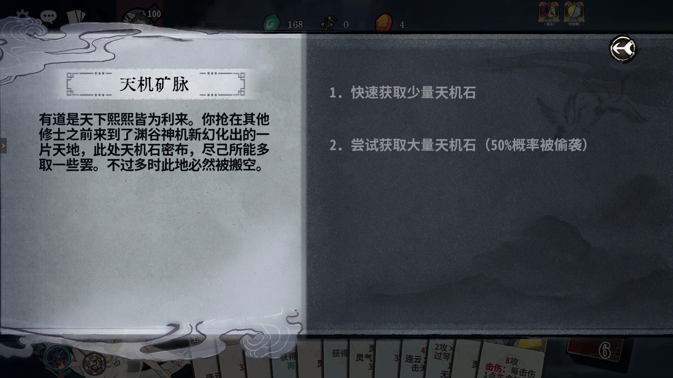 天机矿脉可获得天机石,但如果选择尝试获取大量天机石大概率被偷袭(此时无法调整上场牌,立即进入战斗),所以在进入天机矿脉前,需要先调整好上场牌。