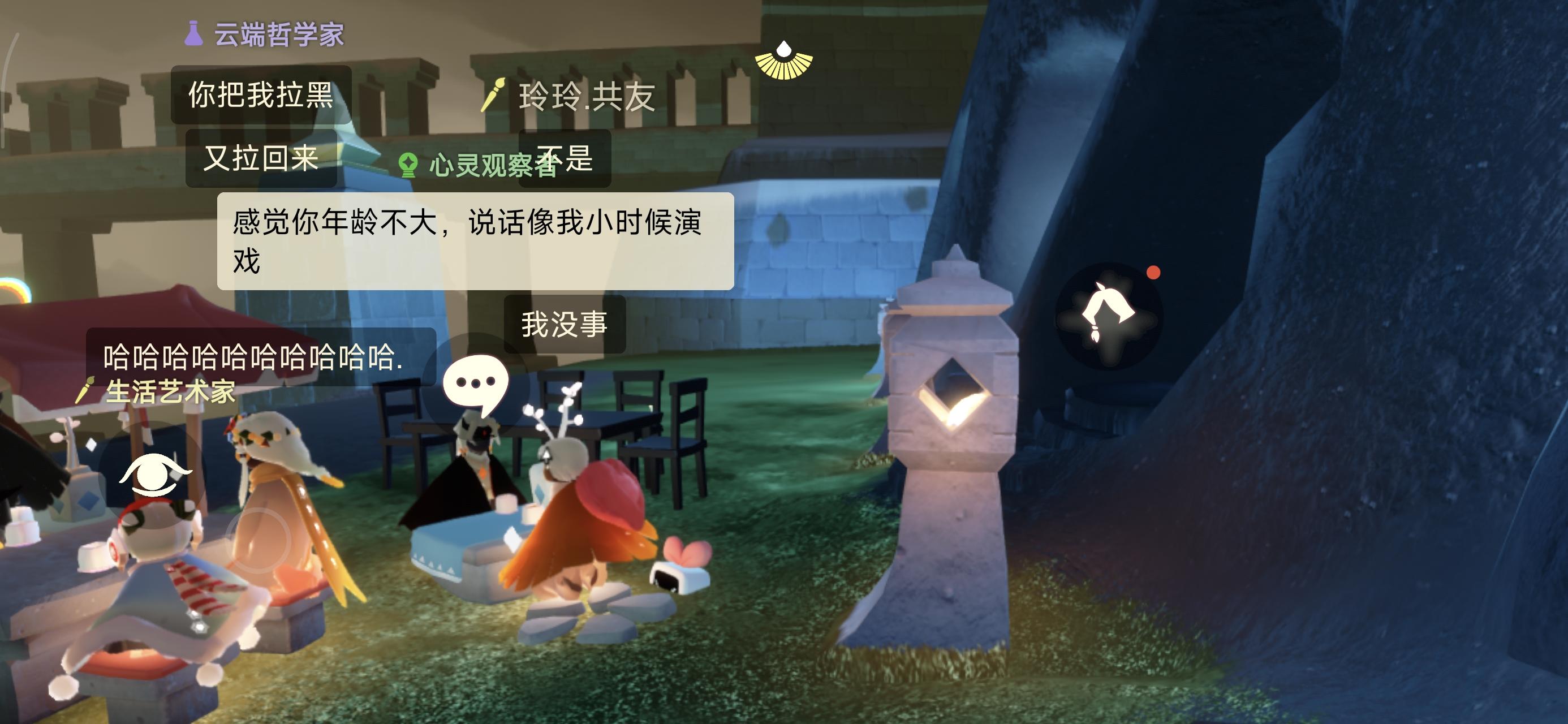 玲玲拉黑的别人,我不咋说话,爱神说玲玲是卡建模找情绪血包,玲玲说“什么意思”“无语”“我”“你们是”也没搞懂在表达什么,打字半天就几个字,中途试图牵我离开我不想去就骗她我没看见标。见她打字艰难我下了桌子跟她说年纪小可以是你很好的一个挡箭牌,不懂的就多问多看,去搜搜攻略什么的。她说好,爱神给我举蜡烛,我没接直接把茶桌放我脚下了,刚坐上玲玲没有任何预兆的把我毕业了然后回遇境又传过来重复两次,貌似是在看拉黑后会怎么说她,发几个❓又走了