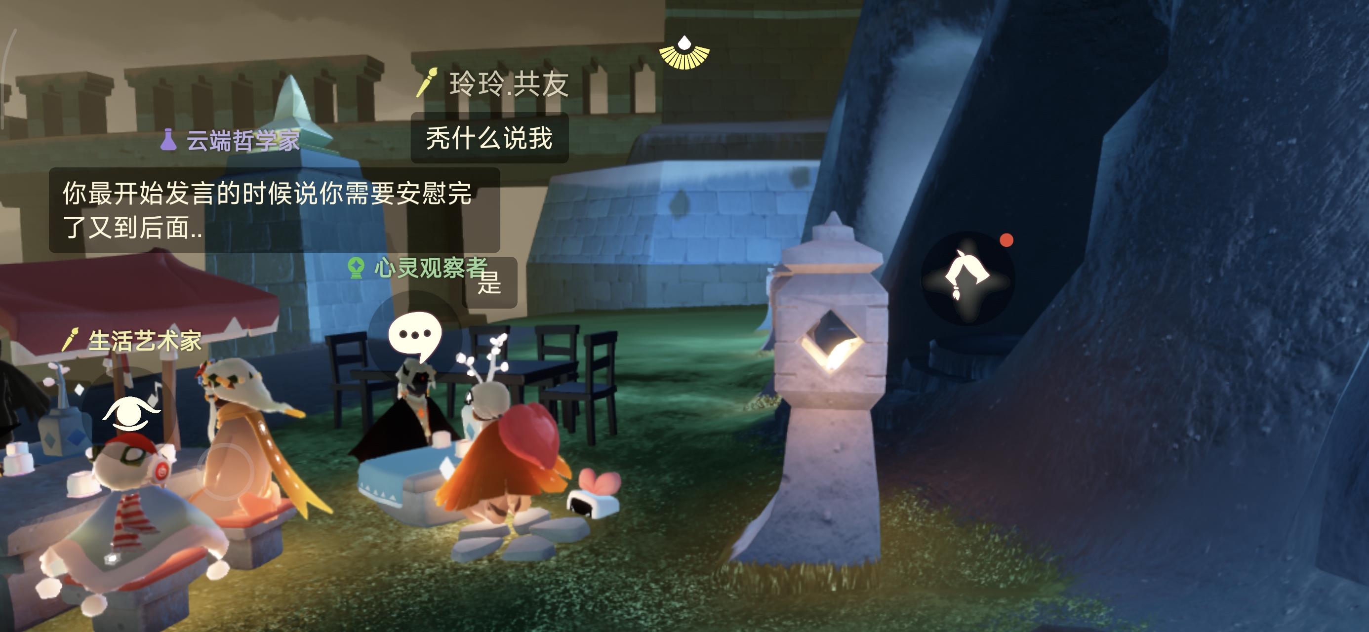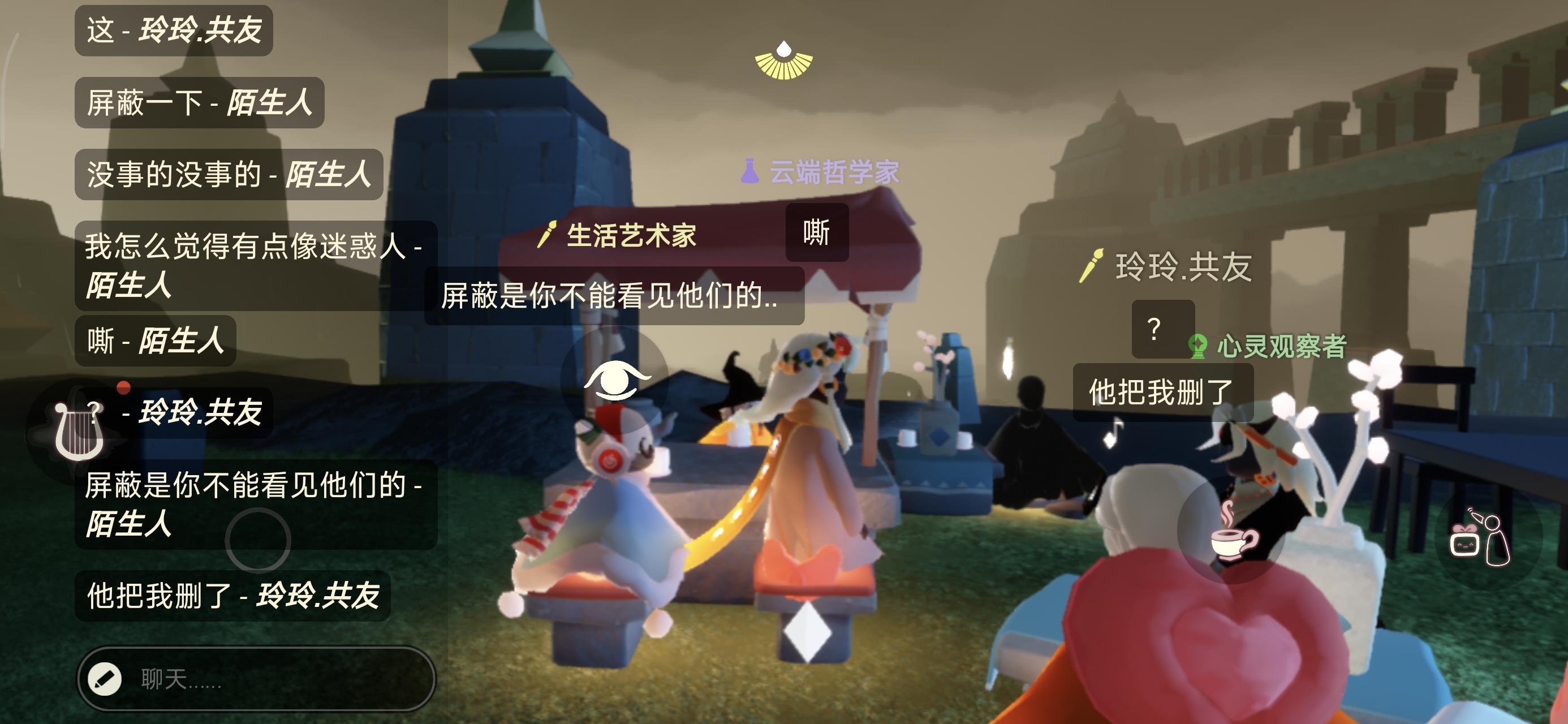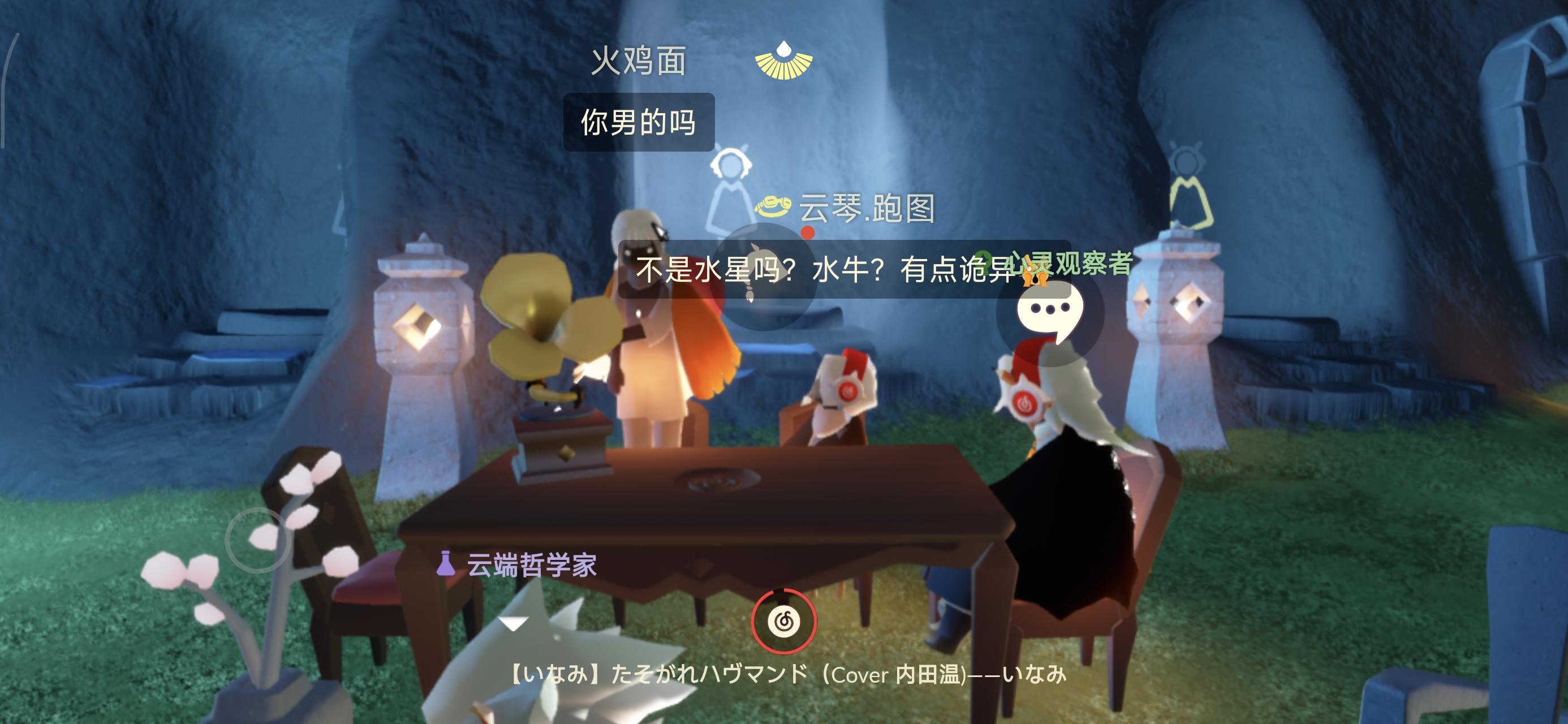 我问ta是不是刚玩没多久,ta说是,就告诉ta光遇之前性别骑士很厉害,上来就问是很冒昧的行为(后面还有更冒昧的),云琴当时跑下面去了看我这么说就回了句“问性别也没太什么吧”,因为这个我也带点刻板印象在里面,被这么一说不好意思了但很快岔开了话题。