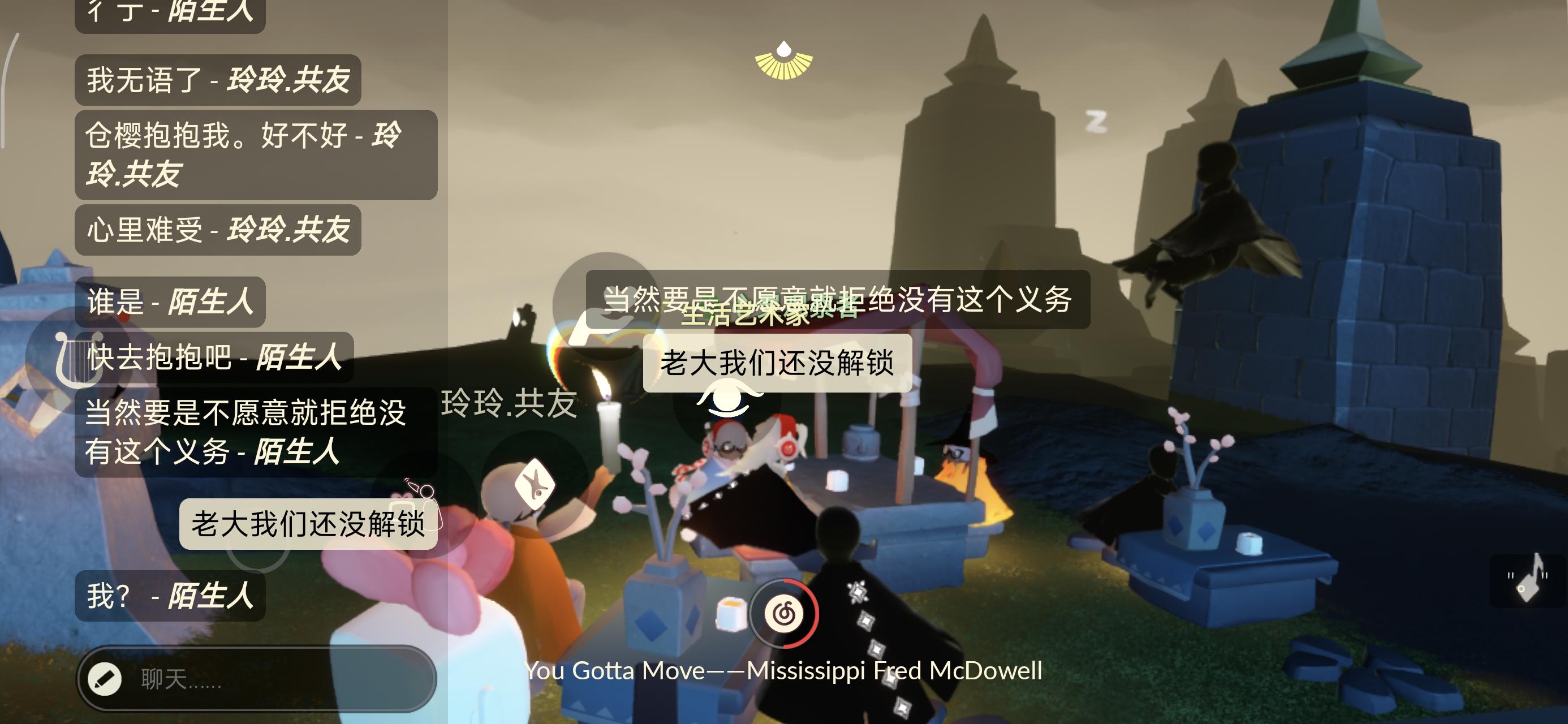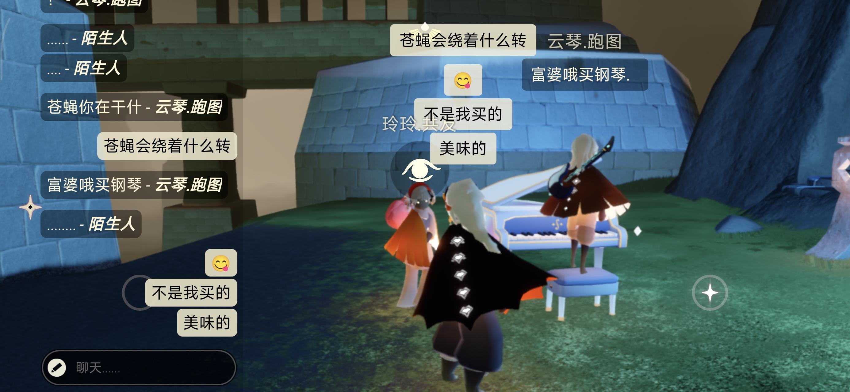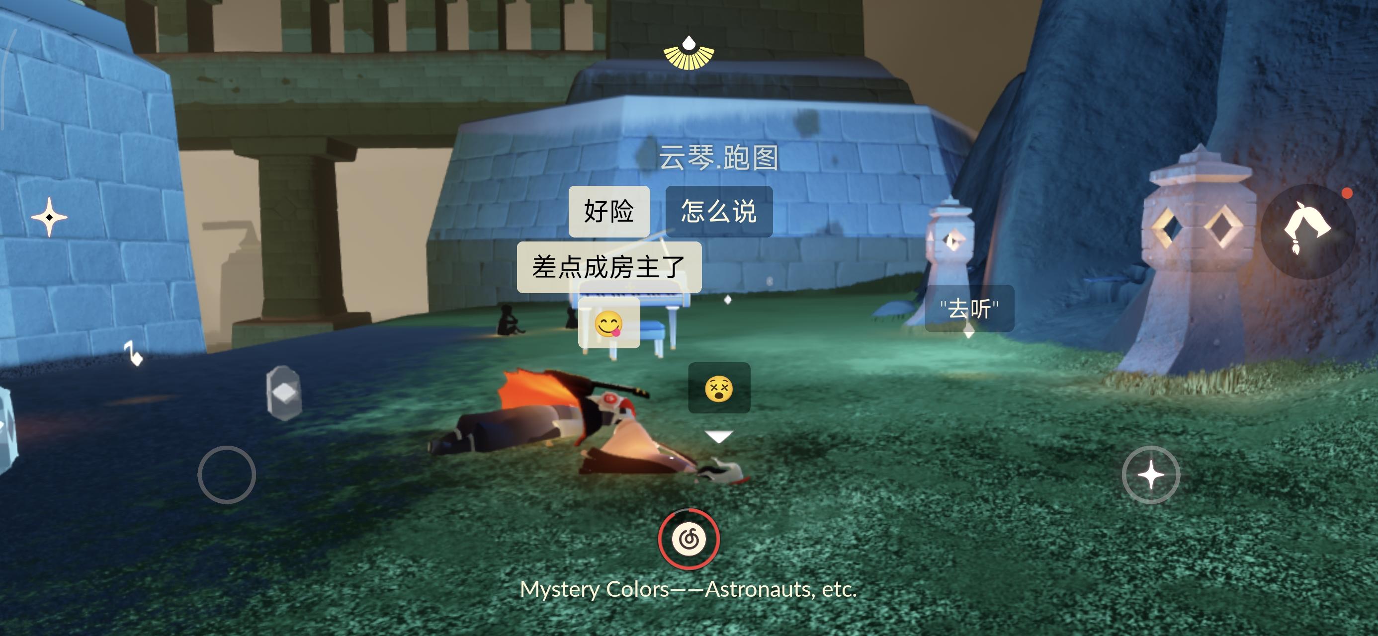 我问ta是不是刚玩没多久,ta说是,就告诉ta光遇之前性别骑士很厉害,上来就问是很冒昧的行为(后面还有更冒昧的),云琴当时跑下面去了看我这么说就回了句“问性别也没太什么吧”,因为这个我也带点刻板印象在里面,被这么一说不好意思了但很快岔开了话题。