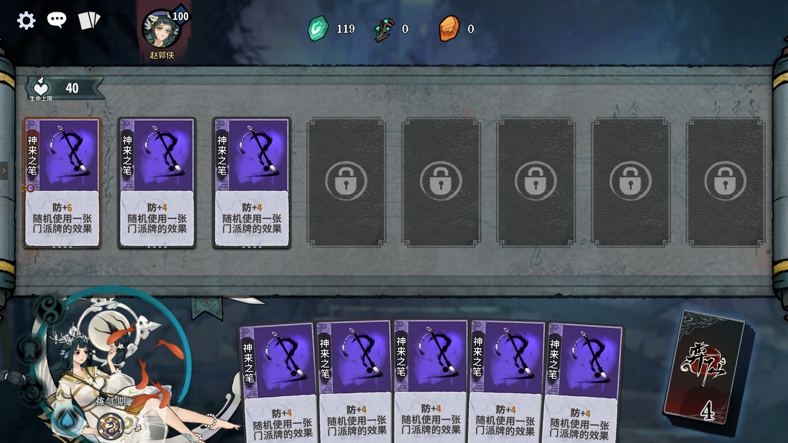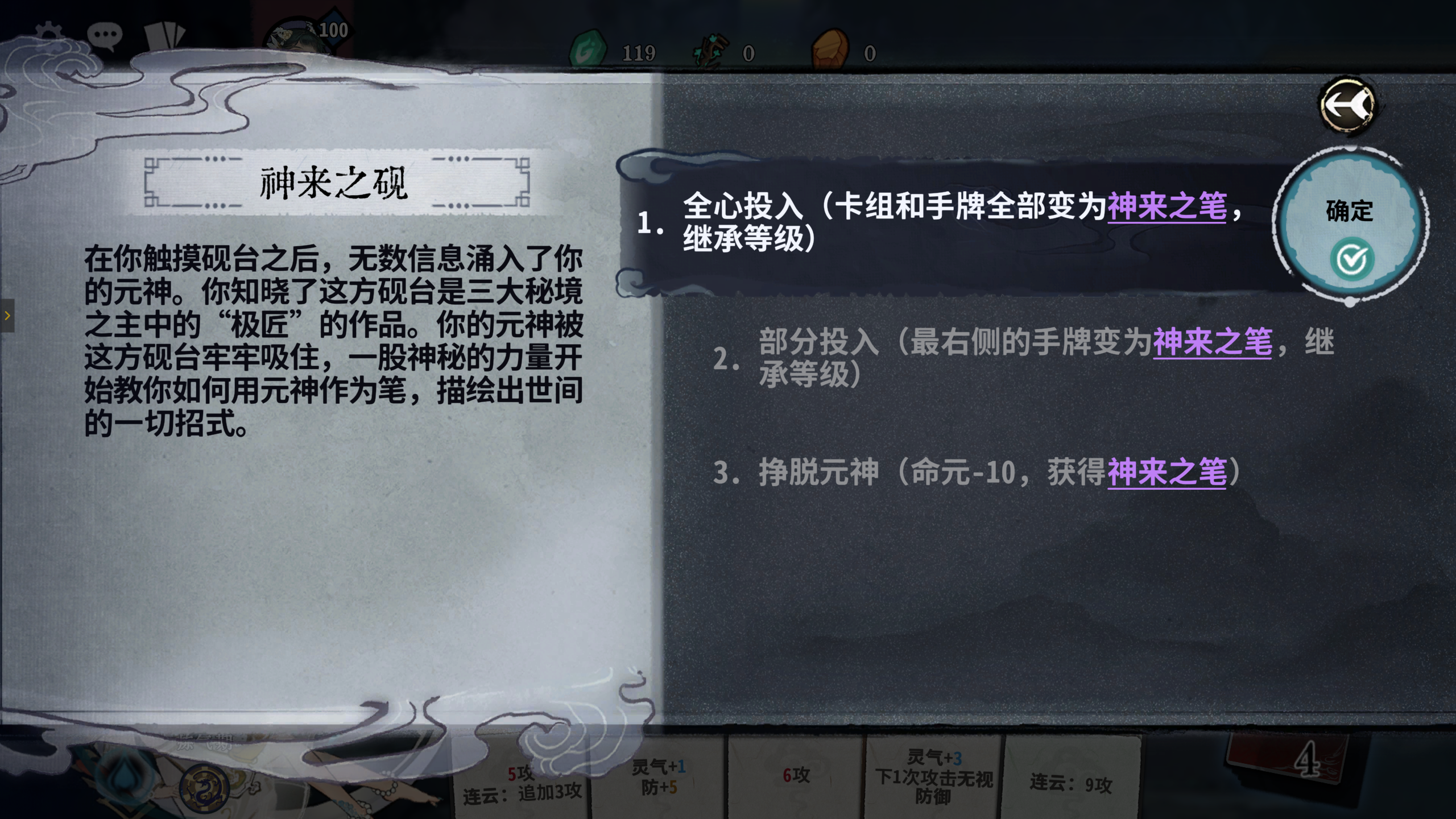 建议刷秘境第一层的随机事件为神来之砚,如果不是则退出本局,重开新游戏,直到秘境第一层的随机事件出现神来之砚,选择卡组手牌全变为神来之笔,尽量保证有8张神来之笔,有多余的再合成,因为前期神来之笔过渡很强,它从炼气期开始,就能变成任意境界的牌(包括化神期、返虚期等),能一直过渡用到突破化神期后再更换,这样前中期均不用换牌,换牌次数可全留到化神期再用。