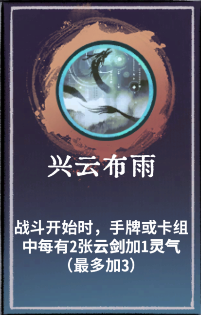 金丹仙命:兴云布雨。战斗开始时,手牌或卡组中没有2张云剑加1灵气(最多加3)。