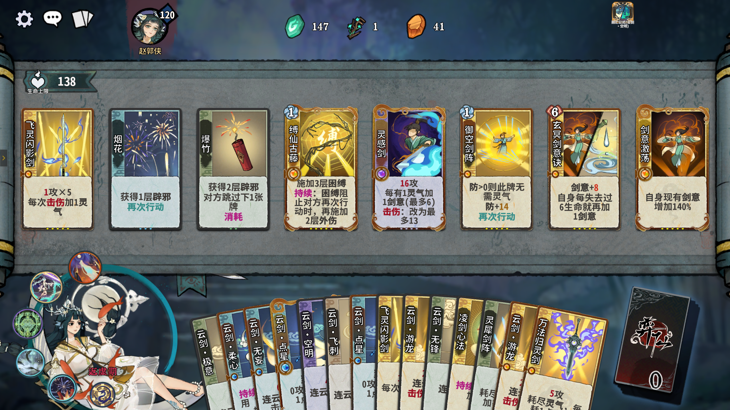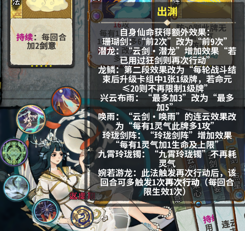 化神期:灵感剑+剑意+多段伤害。注意有出渊仙命后,宛若游龙仙命的效果变为了首张攻击牌后可以继续再动一次,在首次攻击牌后面接一张再动牌。注意留10张云剑牌,触发出渊强化版的兴云布雨开局+5灵气。