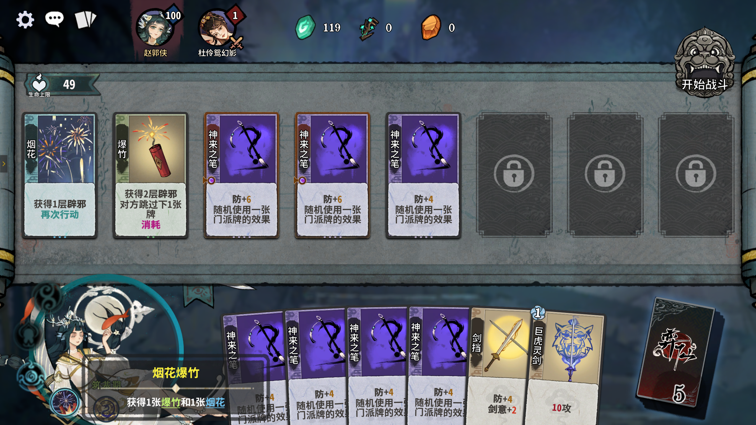 炼气-元婴期:使用爆竹+神来之笔过渡,爆竹跳过对手的关键牌(例如加灵气牌)。