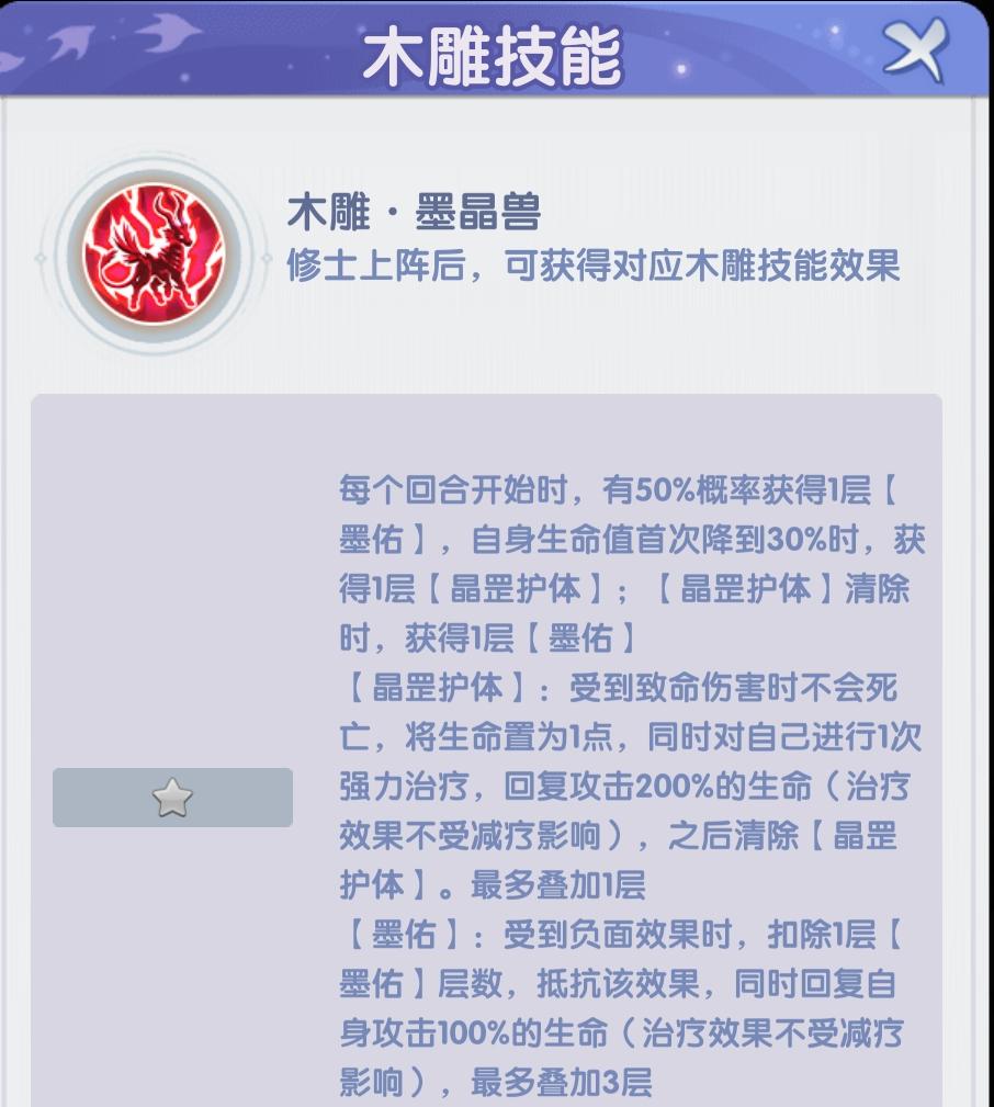 木雕墨晶兽:这个木雕也是牛逼,生命低于30%,获得晶罡护体。这个晶罡护体是受到致命伤害,不死。等于1次免死金牌。而且回复200%攻击生命。护体消失,还会回复1次100%攻击生命。这个也是优先推荐。也给主c带。