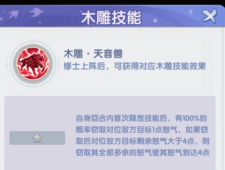 木雕天音兽:偷怒,100%窃取1点怒气,犀利的是窃取目标怒气大于4点,例如:目标有9点怒气,直接目标怒气变4点,多余的5点怒气全偷过来了。
