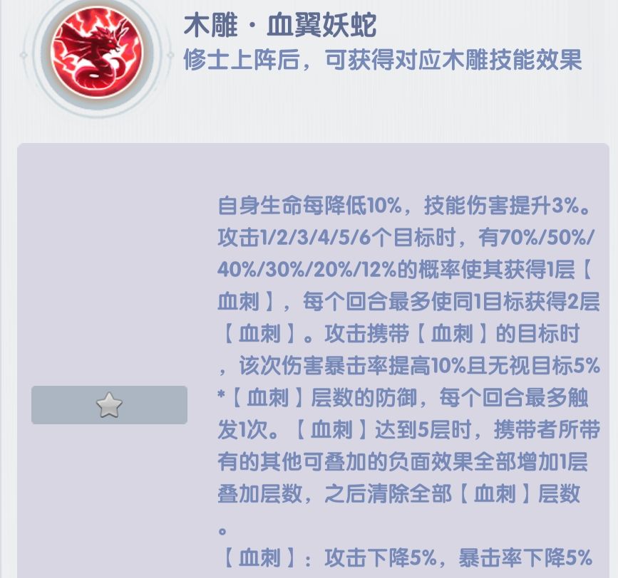 木雕血翼妖蛇:攻击1-6号位置目标,挂血刺,降低对方攻击和暴击率,这个和6星时装技能机制一样。