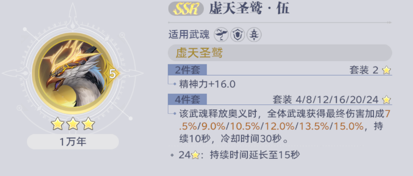 释放奥义时,全体武魂获得7.5%~15.0%最终伤害加成(随星级提升),持续10秒,冷却30秒。