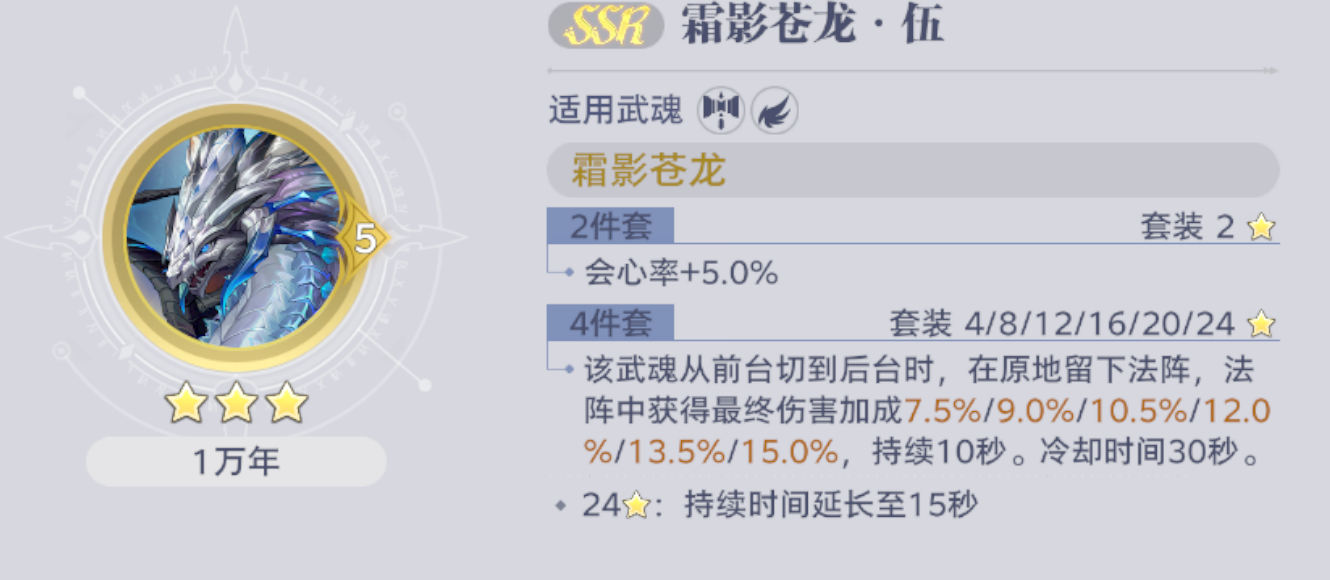 适用场景:百搭辅助型套装,适合能高频释放奥义的武魂,为全队提供稳定增伤。