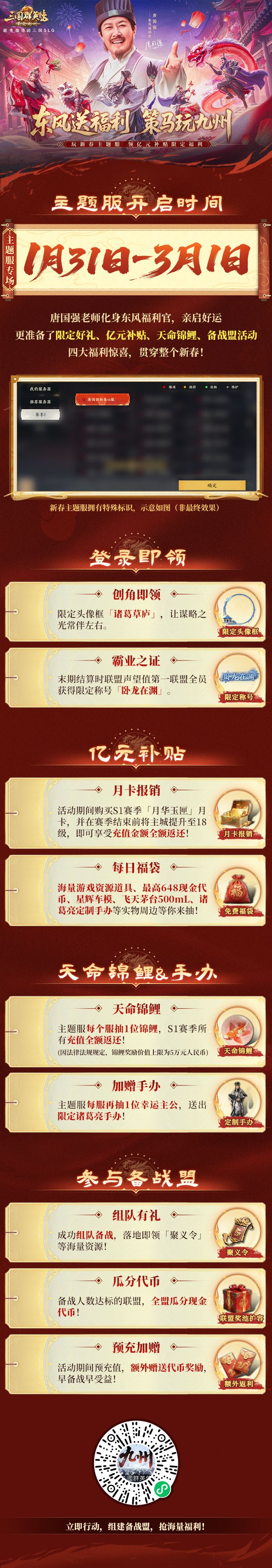 如今,“卧龙”不仅走出史册与荧幕,更化身东风福利官亲临九州!值此新春佳节,唐国强老师给主公们首先送来东风福利(聚义令*10)!主公抓紧领取哦~兑换码:TGQ888,除此之外!更有海量新春福利到来——随着新春主题服上线,限定好礼、亿元补贴、天命锦鲤、备战盟活动四大福利也同步开启!全程助力主公的新春征程!