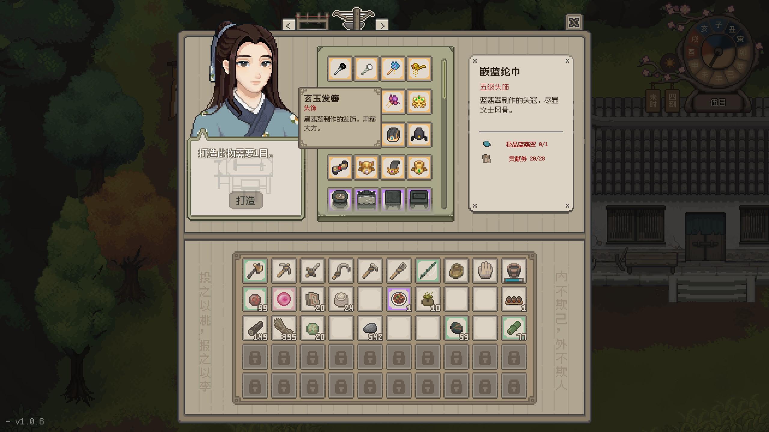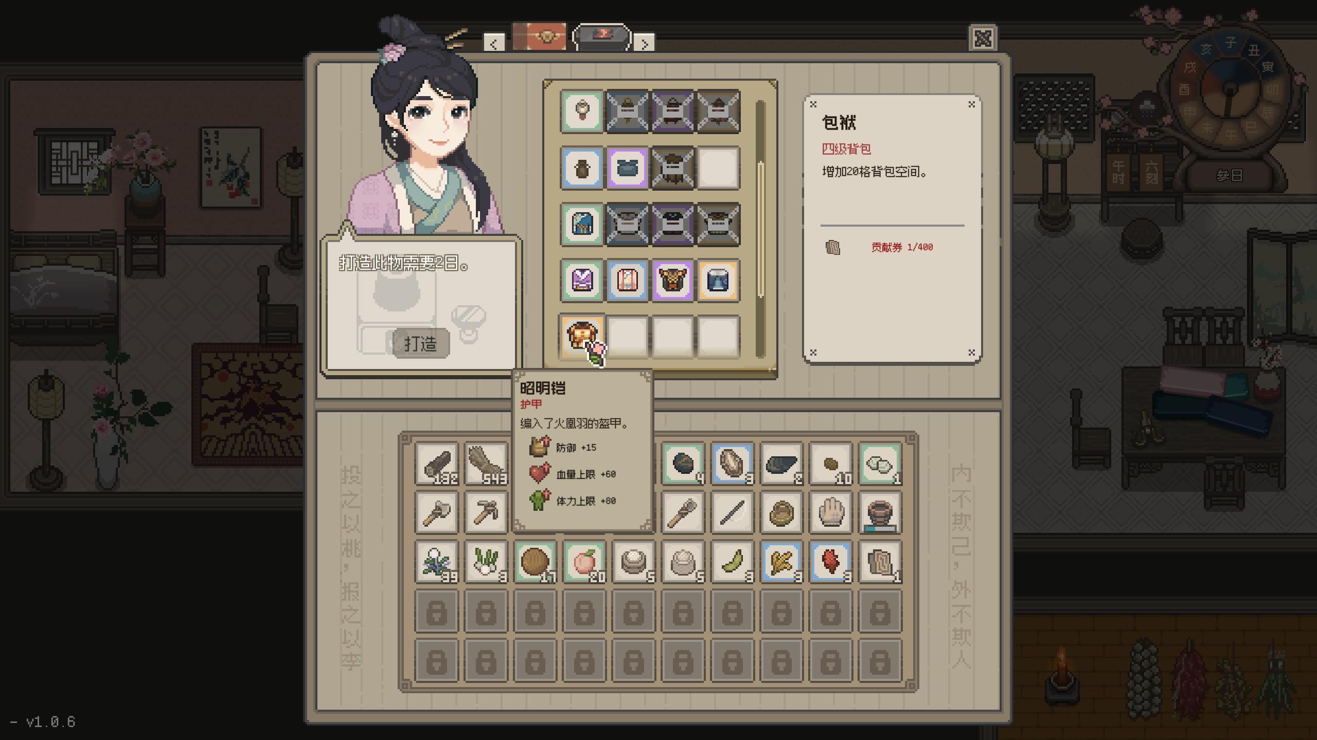 游戏采用了像素画风,画面很不错,特别是人物的头像服饰非常精致。游戏的UI也非常有特点,打开游戏后的“作”和“息”,让人不禁联想起《诗经》中的诗歌“日出而作,日落而息”,带有非常浓厚的中国田园气息。