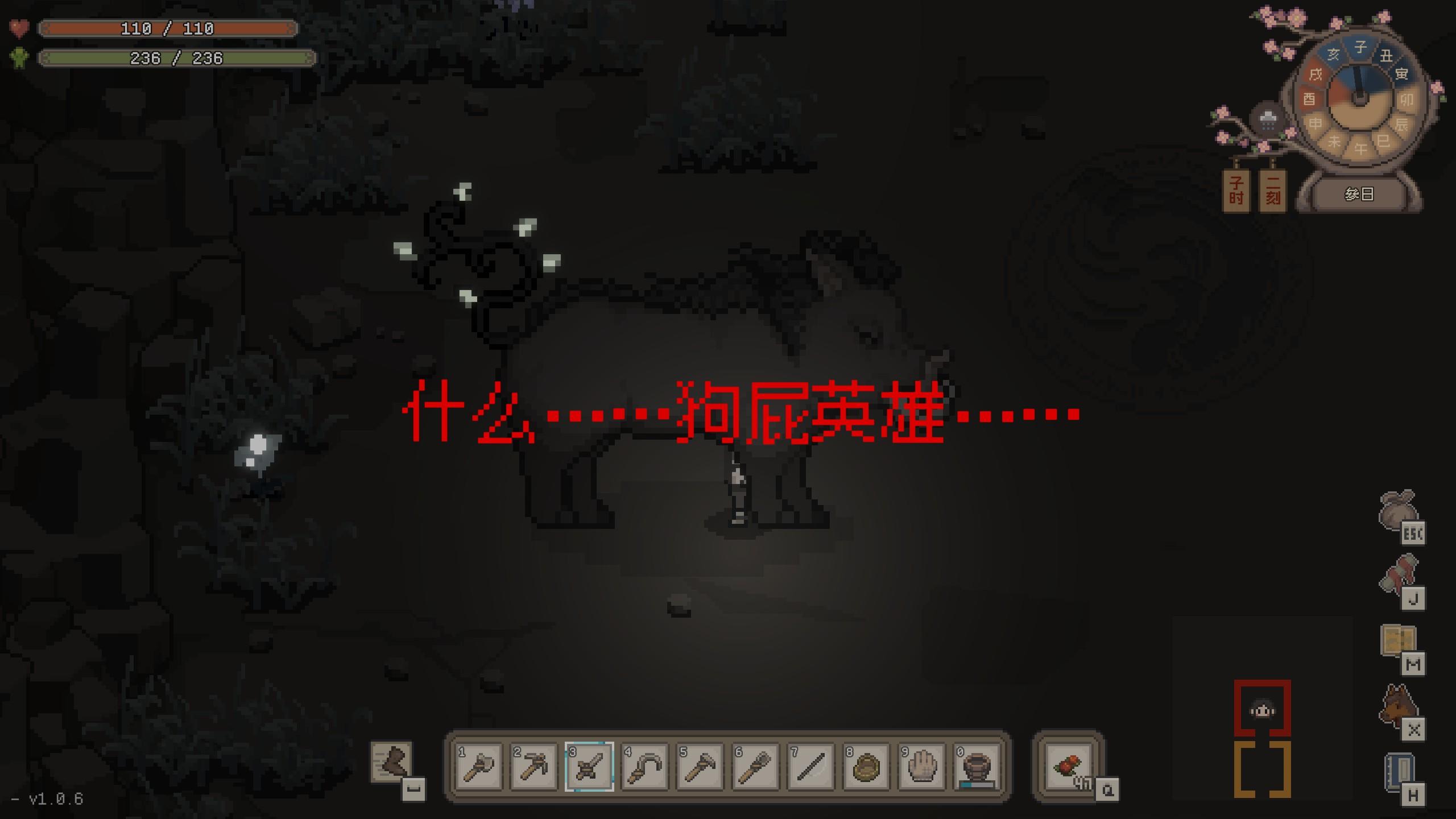 另外就是游戏中的捕鱼,只需要挥杆、起杆即可,但是会有几率空军,某些鱼肚子里还能开出各种东西,不知道能不能开出“大楚兴、陈胜王”的白绫(狗头),如果不喜欢钓鱼,游戏里也提供了捕鱼功能,是一个跟随正确方位按键的小游戏,难度也不高。而游戏中还有很多别出心裁的小游戏,比如采集草药是快速找到目标物体、学习食谱则是稳定进度条、学习制作配方是七巧板拼图形,玩起来都挺有趣的。当然了,如果后期不愿意再重复,也可以在选项菜单里关掉这些小游戏,如果想要快速体验剧情的,甚至可以开启无敌模式,一把木剑刷爆所有boss。