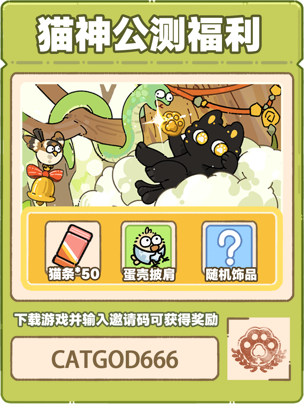 下载游戏并在设置-兑换码中输入【CATGOD666】即可获得【猫条x50】【蛋壳披肩】【随机罕见饰品】