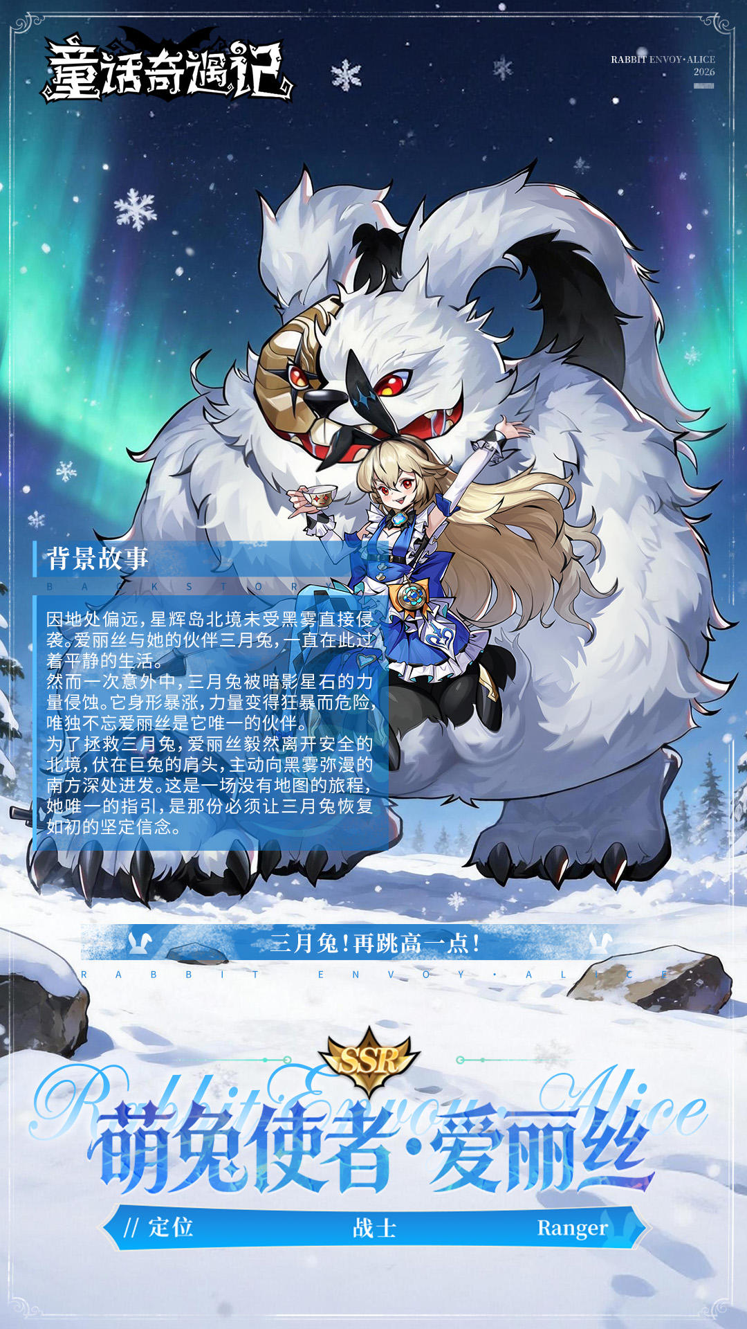 「因地处偏远,星辉岛北境未受黑雾直接侵袭。爱丽丝与她的伙伴三月兔,一直在此过着平静的生活。然而一次意外中,三月兔被暗影星石的力量侵蚀。它身形暴涨,力量变得狂暴而危险,唯独不忘爱丽丝是它唯一的伙伴。