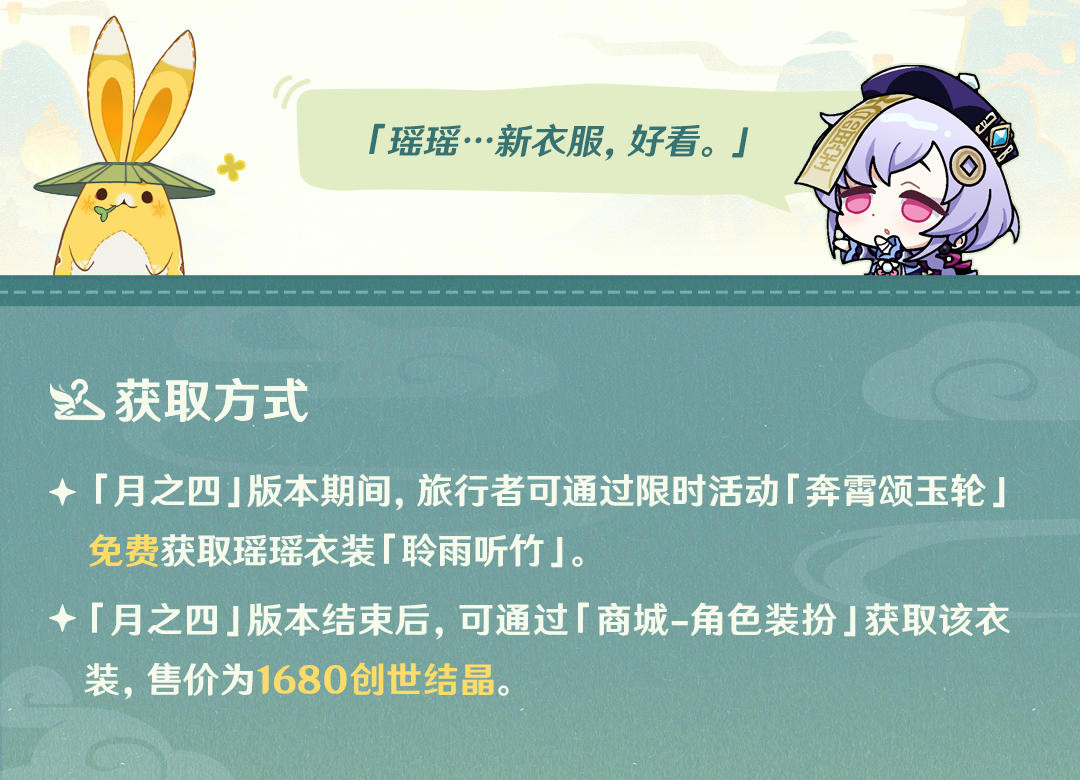 旅行者好呀~瑶瑶全新衣装——「聆雨听竹」将在「月之四」版本中上线,旅行者可通过限时活动「奔霄颂玉轮」免费获得该衣装,一起来看看吧~