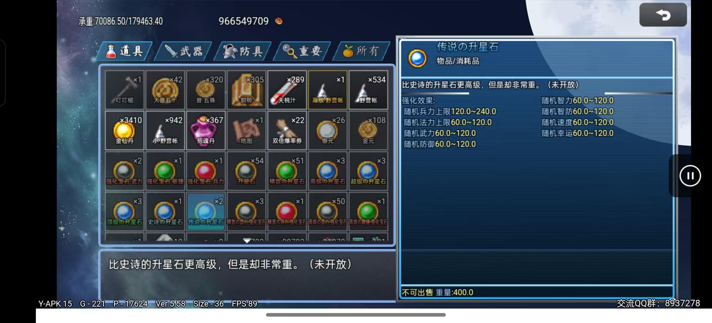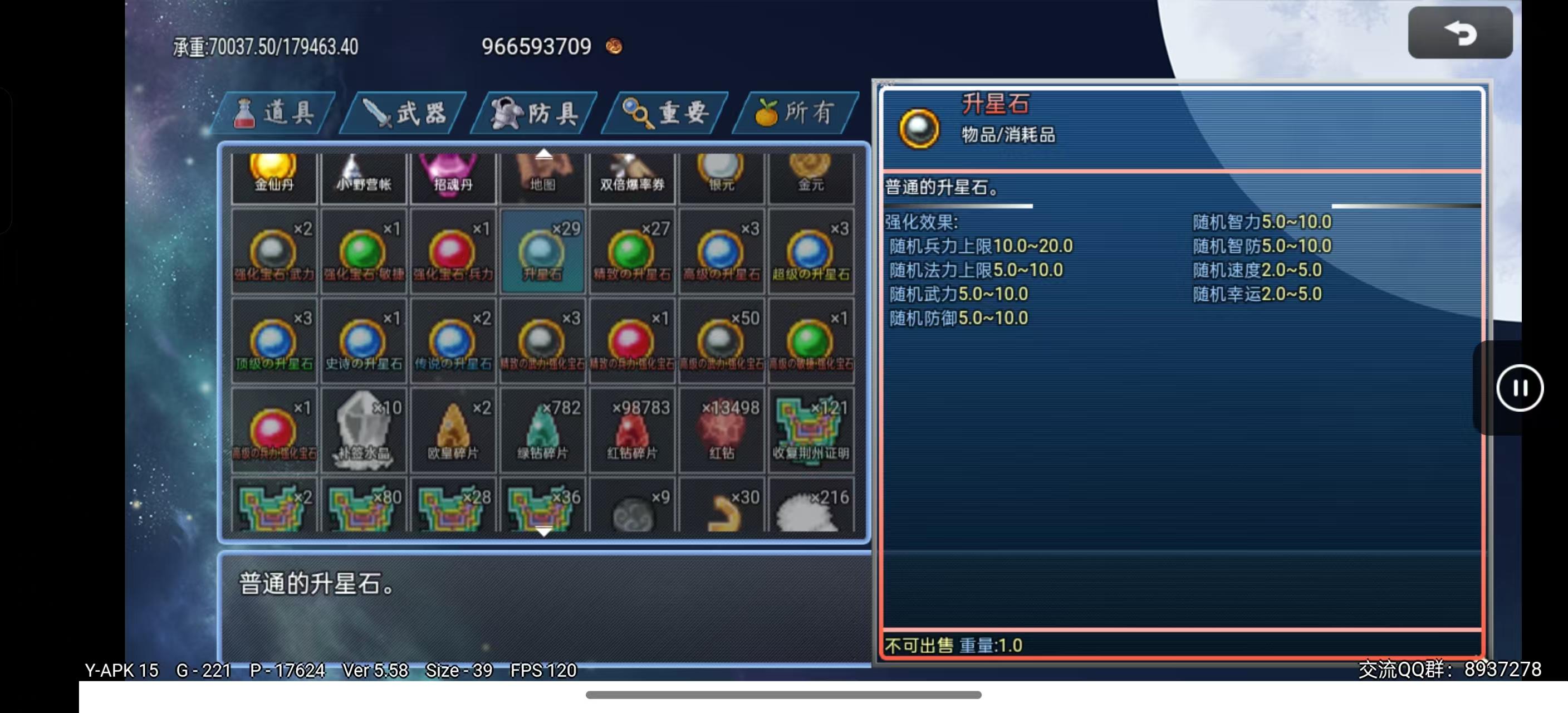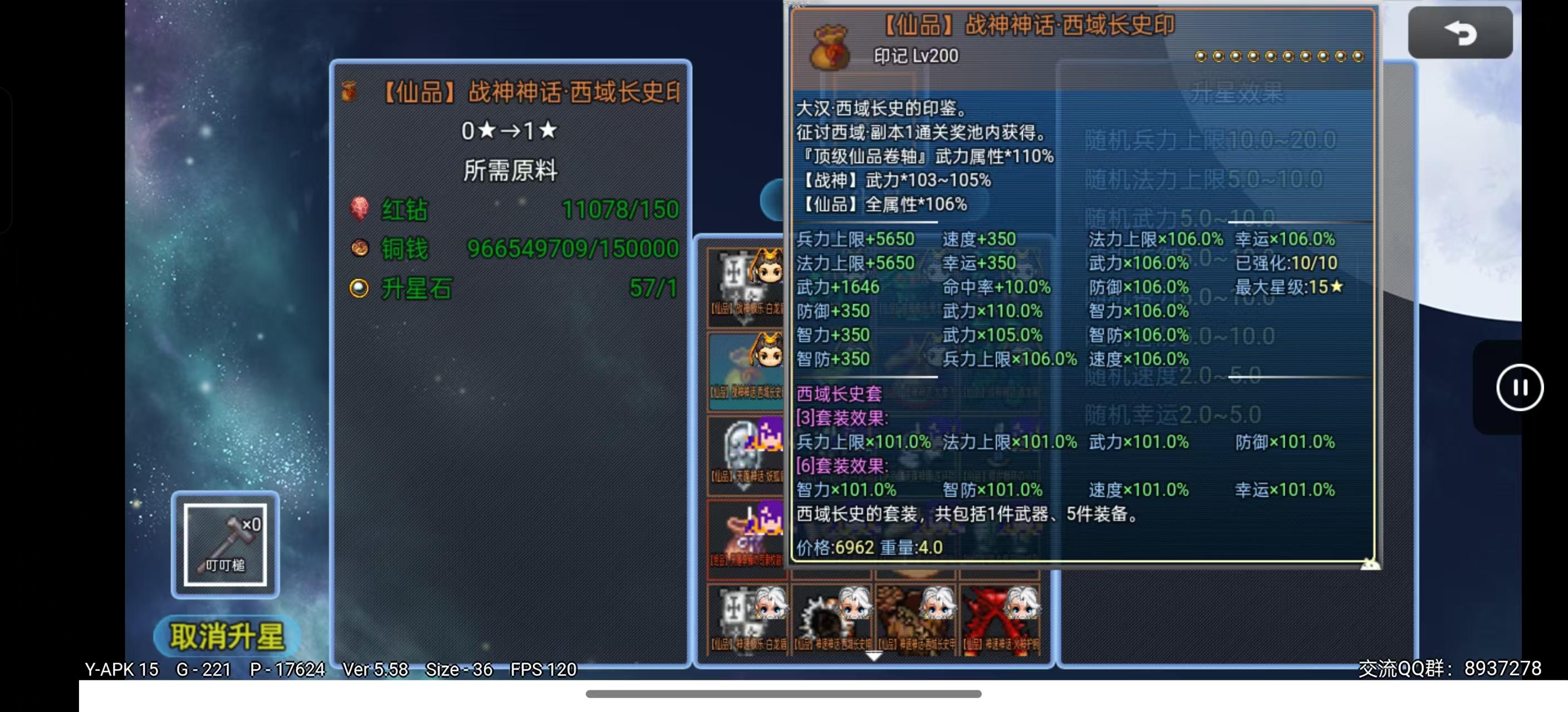 传说升星石随机加成兵力120-240,法力、武力、智力、防御、智防、速度、幸运60-120(可SL)