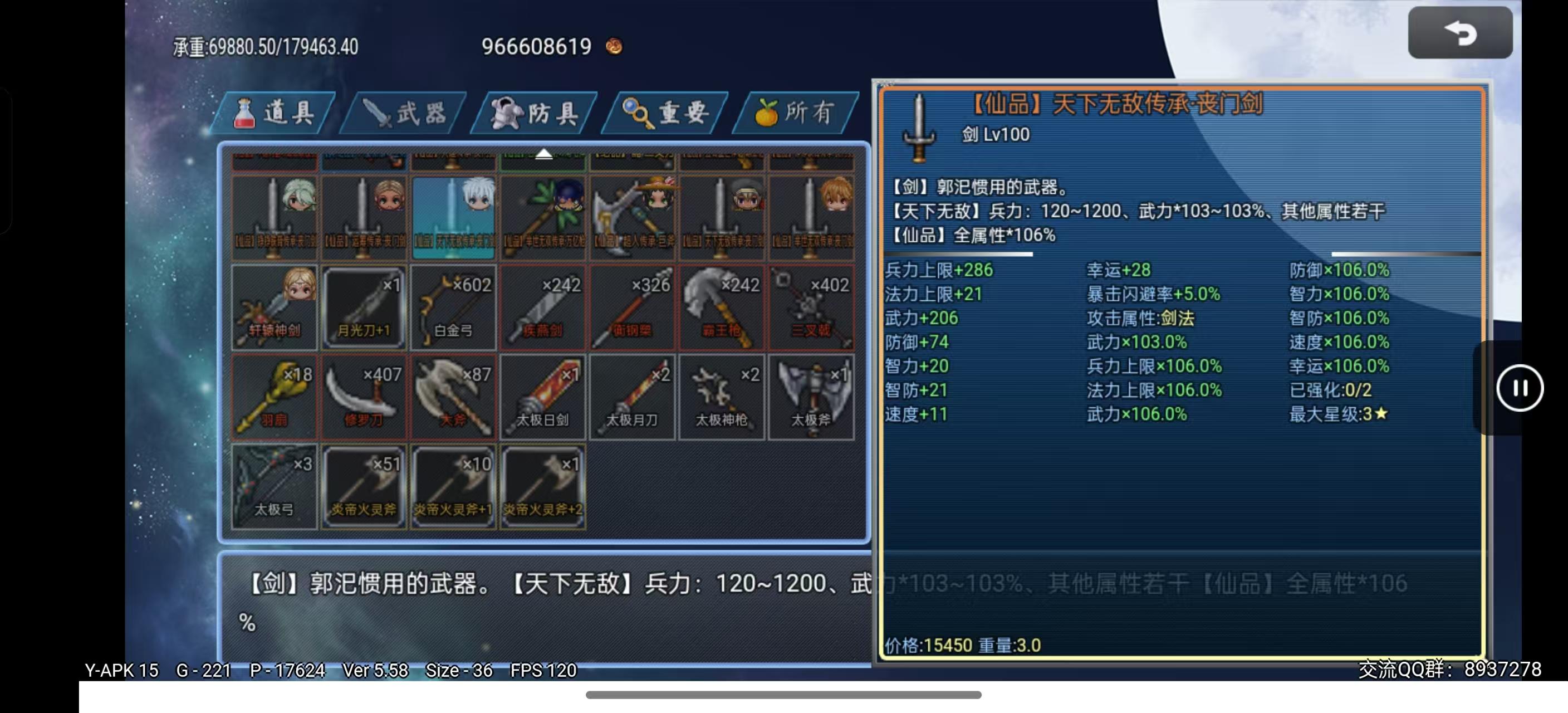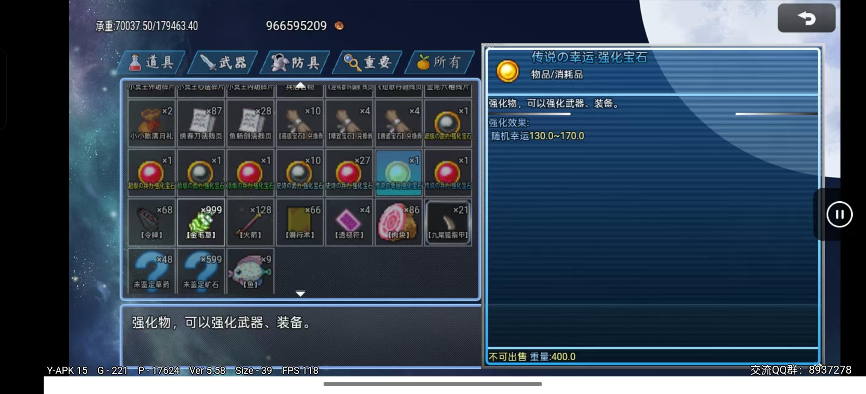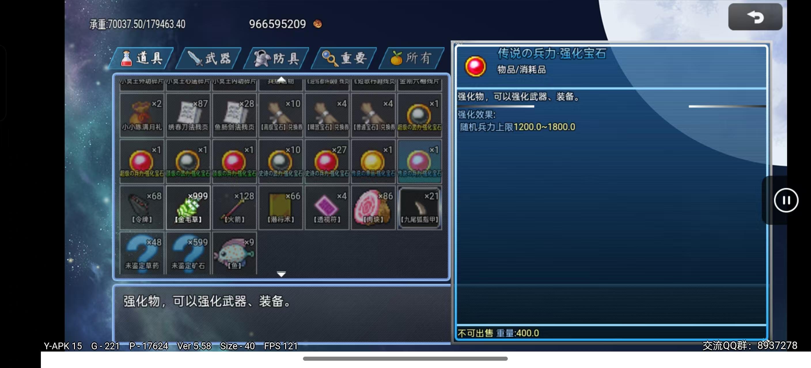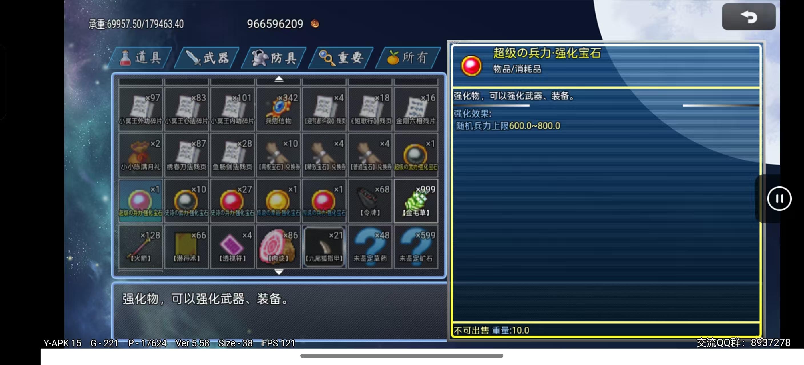 传说强化宝石随机加成130-170武力、智力、防御、智防、速度、幸运(可通过SL强化到最大值)