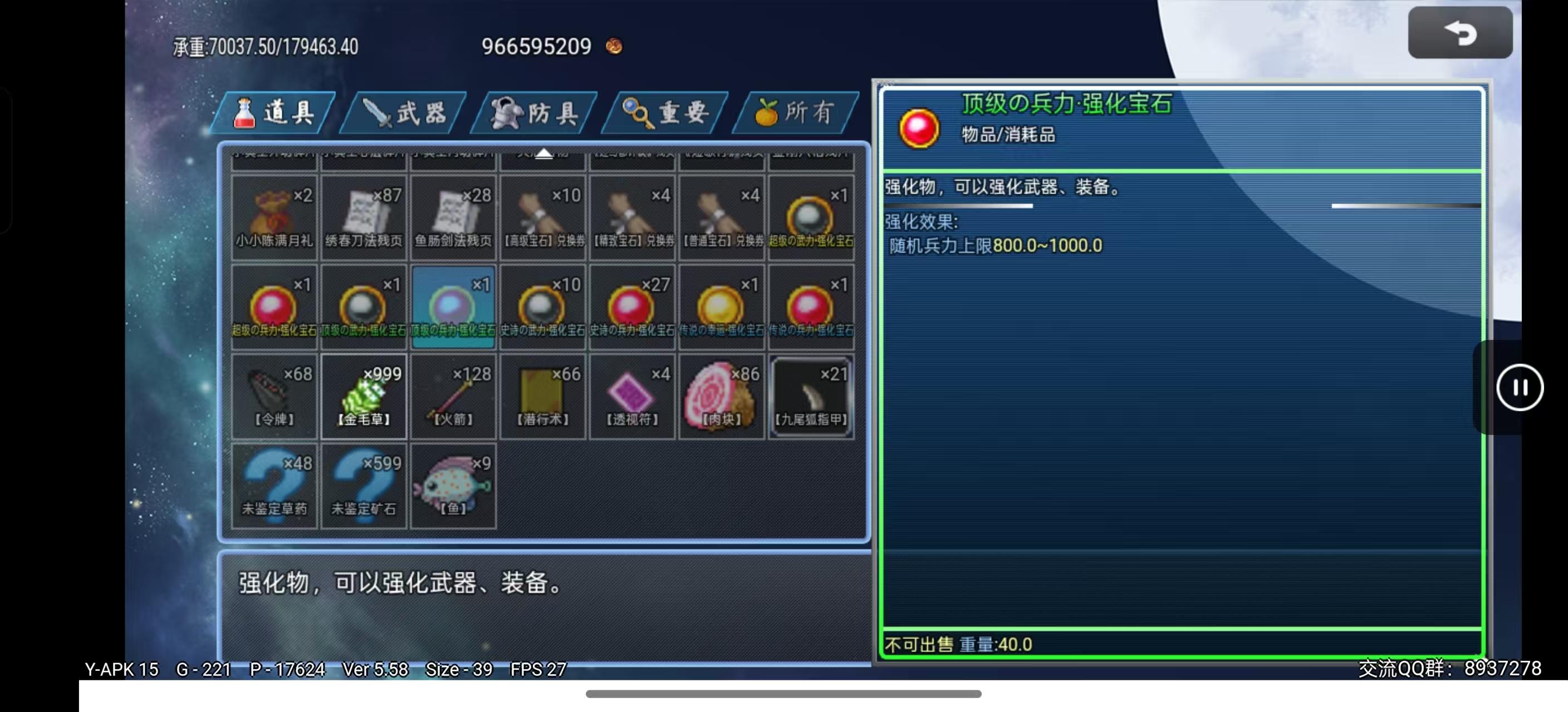 精致强化宝石随机加成20-40武力、智力、防御、智防、速度、幸运(可通过SL强化到最大值)