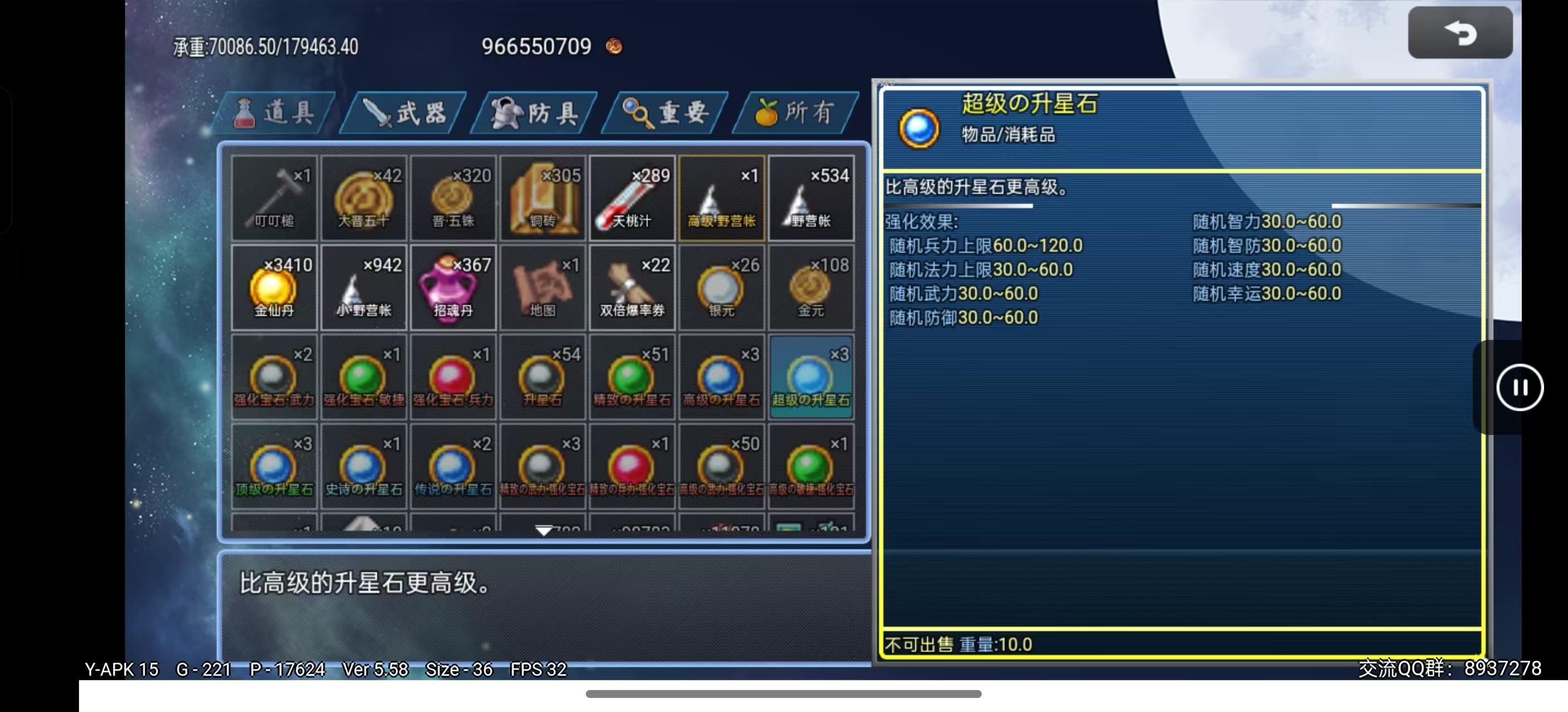 超级升星石随机加成兵力80-160,法力、武力、智力、防御、智防、速度、幸运40-80(可SL)