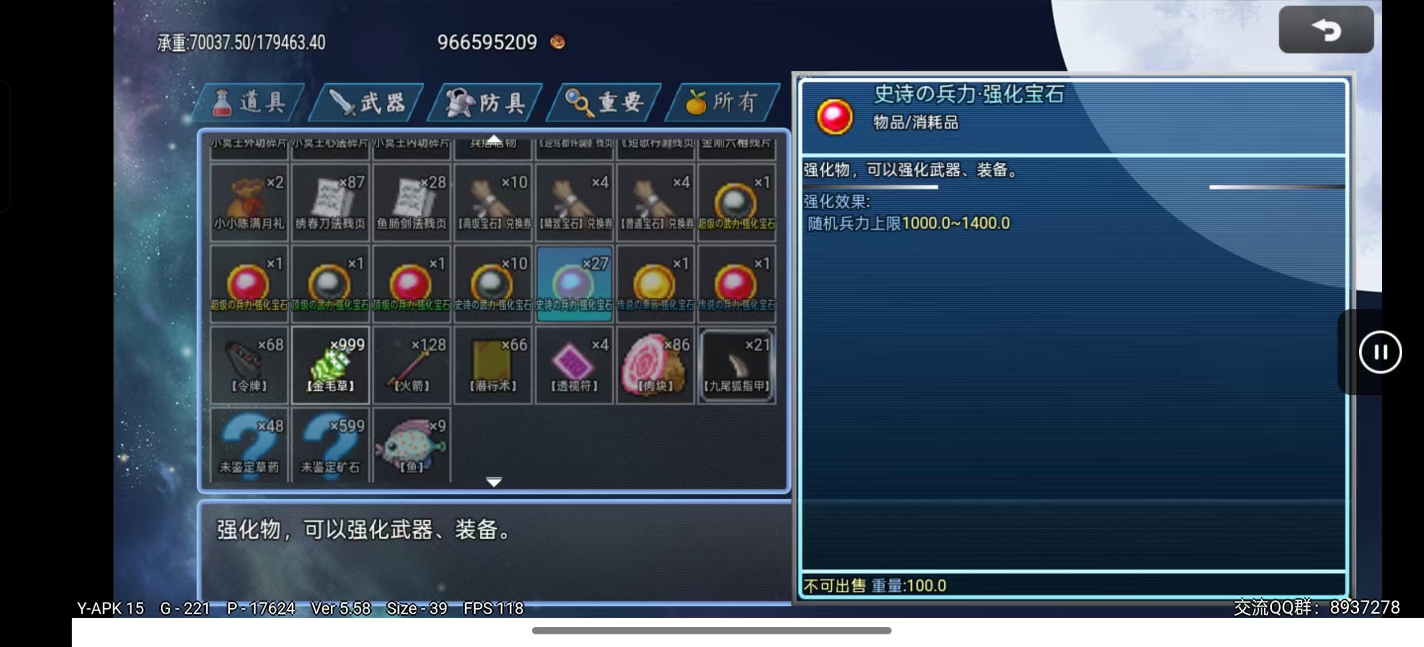 史诗强化宝石随机加成100-130武力、智力、防御、智防、速度、幸运(可通过SL强化到最大值)